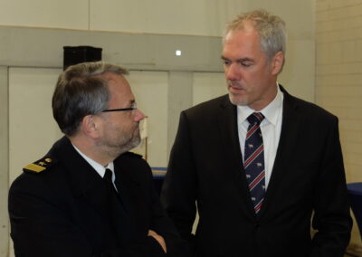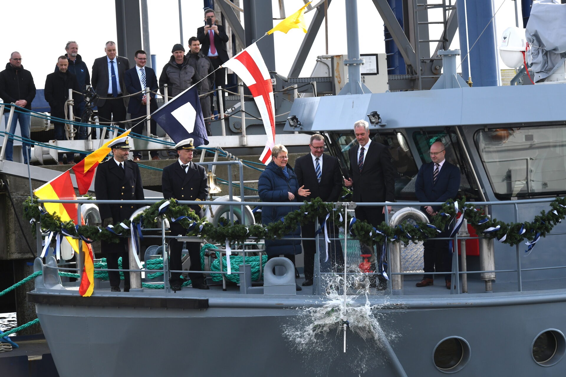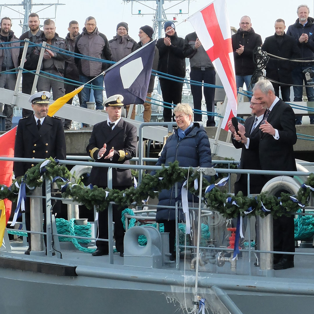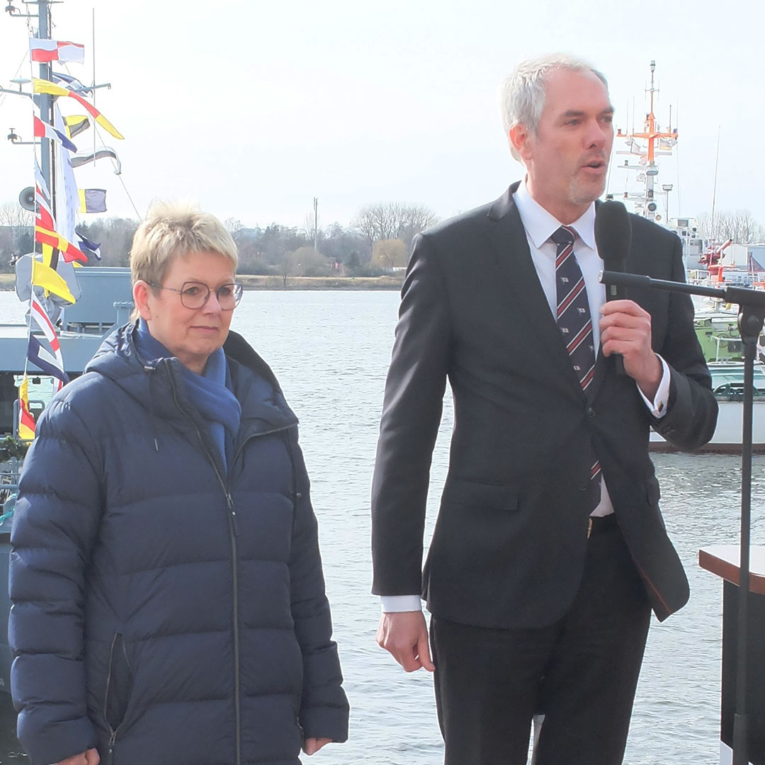 Das war ein großer Tag für die TAMSEN MARITIM Werft in Rostock, denn Schiffstaufen gehören nicht zum Alltag der Reparaturwerft. Getauft wurde am 16. März 2023 ein neues Arbeitsboot der Wehrtechnischen Dienststelle 71 für die Unterstützung der Deutschen Marine. Die „Schleswig“ ist der erste von zwei Neubauten der Klasse 744, die in Eckernförde beheimatet sein werden. Die Tamsen-Eigenentwicklung trägt das Kürzel STS (Sicherung, Transport, Schleppen) und wird zur Absicherung von Seegebieten, zum Personentransport und zur Unterstützung von Forschungsaufgaben eingesetzt. Zudem ermöglichen die Spezialboote den Einsatz von Unterwassergerät und Tauchern. Die neuen Arbeitsboote ersetzen zwei AM und AK Boote aus den sechziger bzw. siebziger Jahren (Klassen 743, 945). Christian Schmoll, Geschäftsführer der TAMSEN MARITIM GmbH erwähnte in seiner Taufrede gut gelaunt, dass dies nach der „Planet“ der zweite Neubau für die WTD 71 in diesem Jahrhundert und für Tamsen das erste „graue Schiff“ überhaupt sei. Zuvor hatte er in seiner Begrüßung die herausragende Zusammenarbeit mit der SET – Werft in Tangermünde hervorgehoben. Die SET Schiffbau- u. Entwicklungsgesellschaft gehört zur Heinrich Rönner Gruppe in Bremerhaven. SET baut auch das zweite STS‐Boot, das ebenfalls noch in diesem Jahr abgeliefert wird. Beide Schiffe wurden aus Kapazitätsgründen in Sachsen‐Anhalt gebaut. Im Frühjahr 2022 waren die Arbeitsboote dort auf Kiel gelegt worden. Fünf Jahre nach Planungsbeginn und 2,5 Jahre nach Vertragsschluss hat man „es fast geschafft“ sagte Schmoll mit Verweis auf den nicht ganz eigehaltenen Zeitplan, der mit seinem Team nun mit den Rest- und Abschlussarbeiten auf die Indienststellung zusteuert. Das neue Boot weist einige Besonderheiten auf, unter anderem ein leistungsfähiger Kran der Firma Palfinger, MAN Diesel erstmals mit Abgasnachbehandlung und höchste Manövrierfähigkeit durch eine Querschubanlage. Taufpatin der „Schleswig“ ist Frau Susanne Ross, Bürgervorsteherin und Leiterin der Ratsversammlung der Kreisstadt. Frau Ross hatte ein Bild des früheren Minensuchbootes „Schleswig“ dabei, welches von 1958 bis 2000 in der Marine diente.