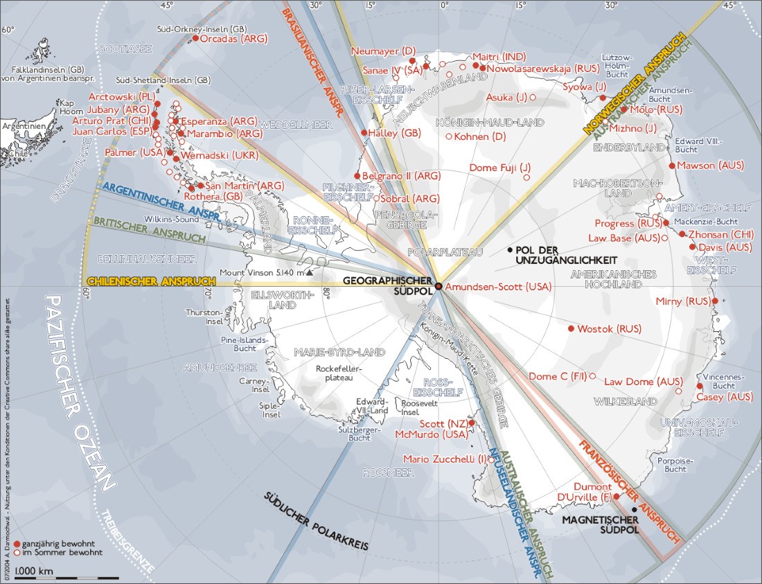 Alle Forschungsstationen und "beanspruchte" Gebiete im antarktischen Ozean. Grafik: Wikimedia, Creative Commons