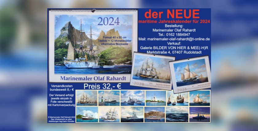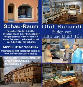 Bestellungen über marinemaler-olaf-rahardt@t-online.de oder Direktverkauf in der Galerie, Marktstraße 4, 07407 Rudolstadt. www.marinemaler-olaf-rahardt.de