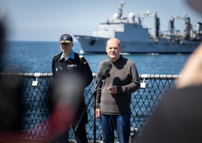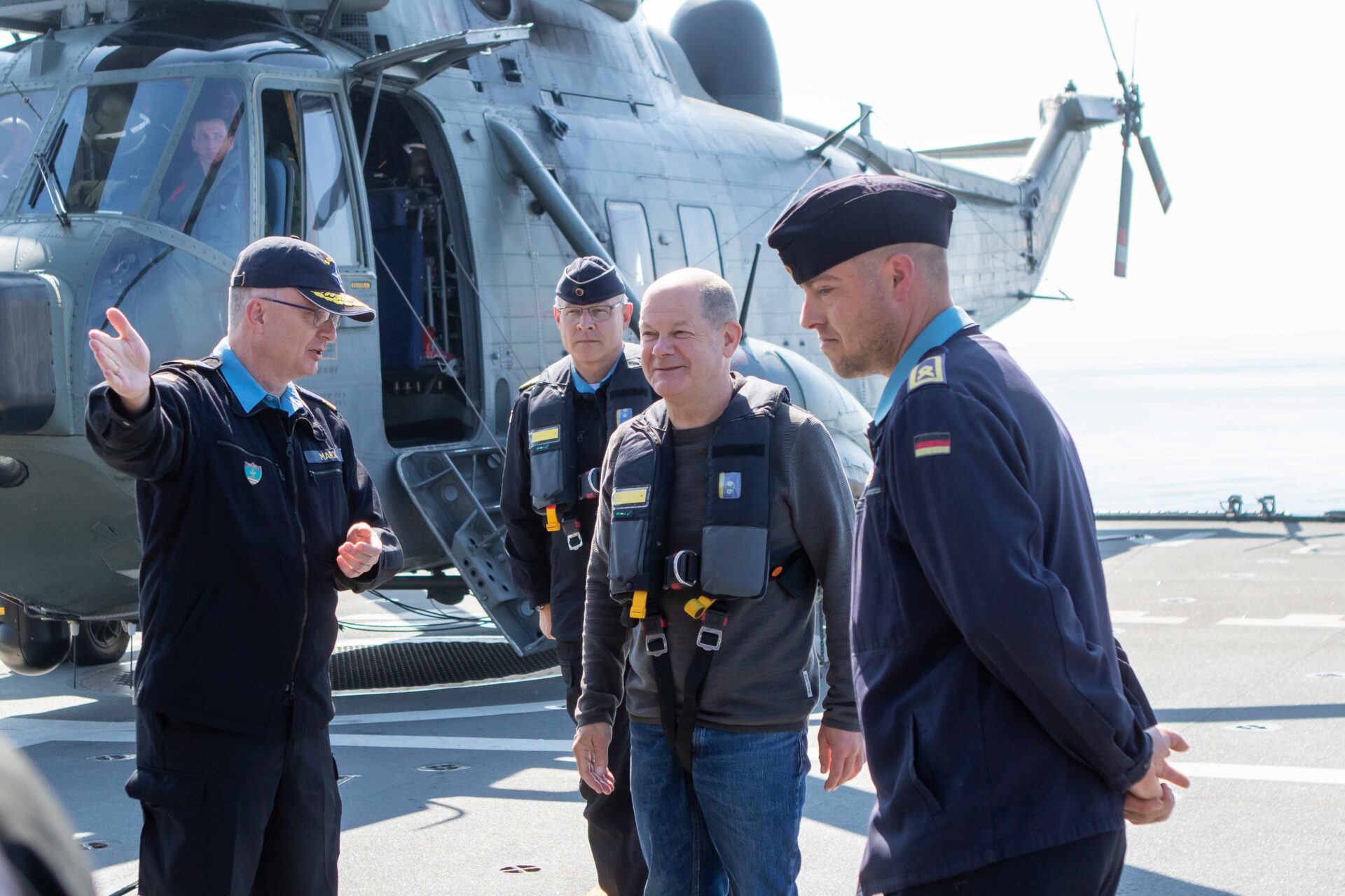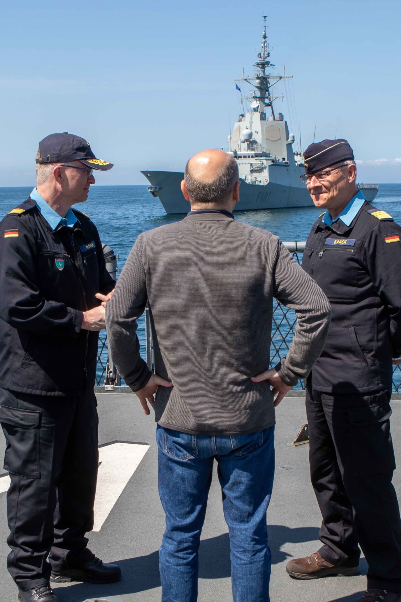 Der Kanzler zeigte sich auf der Fregatte „sehr beeindruckt über die Leistung, über die schwere Arbeit, die wir hier gesehen haben“. Durch den russischen Angriffskrieg gegen die Ukraine habe sich die Sicherheitslage Europas und der ganzen Welt verändert. „Deshalb ist es wichtig, dass wir uns überall zusammentun im Rahmen der NATO, dass wir gemeinsam üben, dass wir uns vorbereiten und auch zeigen, dass wir in der Lage sind, das Bündnis und die Mitgliedsstaaten, die Demokratie und die Freiheit zu verteidigen“, so Scholz.