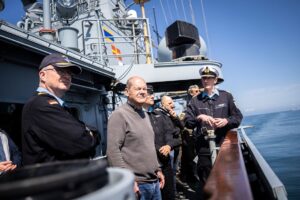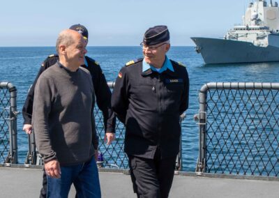 Bundeskanzler Olaf Scholz hat am Montag, dem 5. Juni 2023, der Deutschen Marine einen Truppenbesuch abgestattet, um ein umfassendes Bild vom Fähigkeitsspektrum der Deutschen Marine zu gewinnen. Nach einem kurzen Gespräch mit dem Inspekteur der Marine, Vizeadmiral Jan Christian Kaack, und dem Befehlshaber der Flotte und Unterstützungskräfte, Vizeadmiral Frank Lenski, im Marinekommando in Rostock-Warnemünde wurde er per Hubschrauber auf die Fregatte „Mecklenburg-Vorpommern“ gebracht.