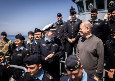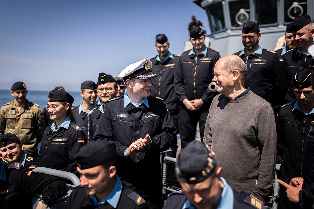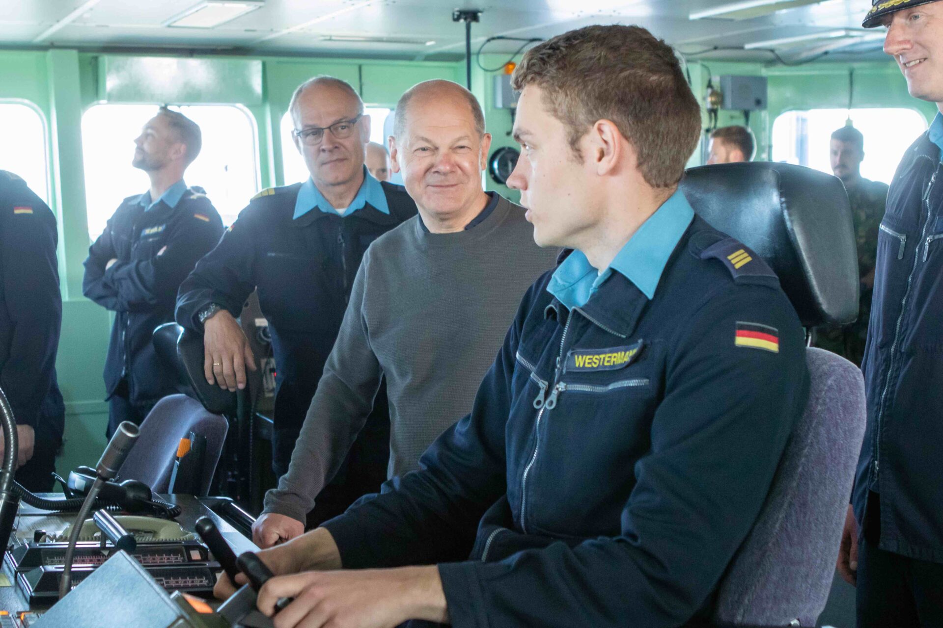 Bundeskanzler Olaf Scholz auf dem Minenjagdboot Bad Bevensen. Foto: Bundesregierung/Kuegeler