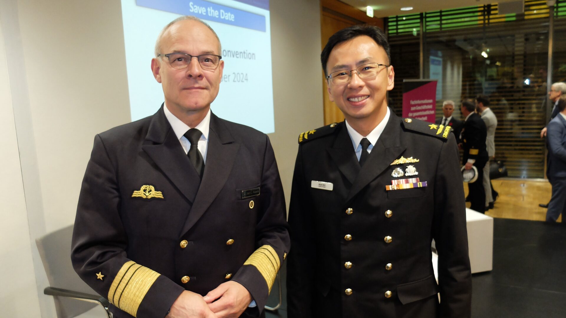 Inspekteur Marine, Vizeadmiral Jan Christian Kaack und Flottillenadmiral Sean Wat, Befehlshaber der Marine Singapurs. Foto: hsc