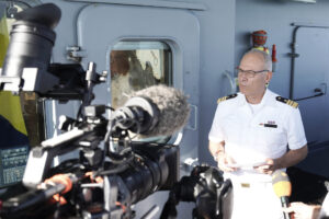 „Unser gesamtes Deployment geht einmal rund um die Welt. 7 Monate mit 2 Schiffen, ein Schiff davon mit der Besatzung die ganze Zeit an Bord, das andere Schiff mit einem Crew-Wechsel alle paar Monate. Folgt im Grunde der Erkenntnis der Wichtigkeit der Unverletzbarkeit der Seewege, stellen sie sich vor oder erinnern sie sich an den Ausfall der des Suez-Kanals durch die Havarie der „Ever Given“. Das hatte monatelange Konsequenzen und Auswirkungen auf den Wohlstand in Europa gehabt. Und was mit den Huthi derzeit passiert, was quasi auch dem Sperren eines Seeweges gleichkommt, hat ähnliche Effekte“, sagte der Inspekteur. „Sichere Seewege sind eben für unseren Wohlstand und unser Wohlergehen in Europa zwingend erforderlich. Und wir wollen uns gar nicht vorstellen, was passieren würde, wenn die Straße von Malakka gestört wird. Das zweite ist, dass eben viele Nationen, kleinere Nationen und Partner in der Region im Indopazifischen das Gefühl haben, dass die internationale regelbasierte Ordnung gefährdet ist, weil es Nationen gibt, die sich daran nicht halten. Und das wollen wir sehr deutlich zum Ausdruck bringen, dass wir für das Einhalten der regelbasierten internationalen Ordnung einstehen, und letzten Endes machen wir nichts anderes als die Indopazifik Richtlinien oder Leitlinien der Bundesregierung und den Nationalsicherheitsstrategie umzusetzen.“ Der Inspekteur der Marine äußerte sich ferner ausgesprochen positiv zu dem Verlauf der gemeinsam mit den Partnern im ostasiatischen Raum durchgeführten Übungen insbesondere RIMPAC mit 29 Nationen habe ihn beeindruckt.