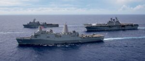 Kampfgruppe ESG7 um den Hubschrauberträger USS „America“ mit Docklandungsschiffen USS „New Orleans“ und USS „Germantown“ (hinten), Talisman Sabre 2021. Foto: US Navy/J.Almazan