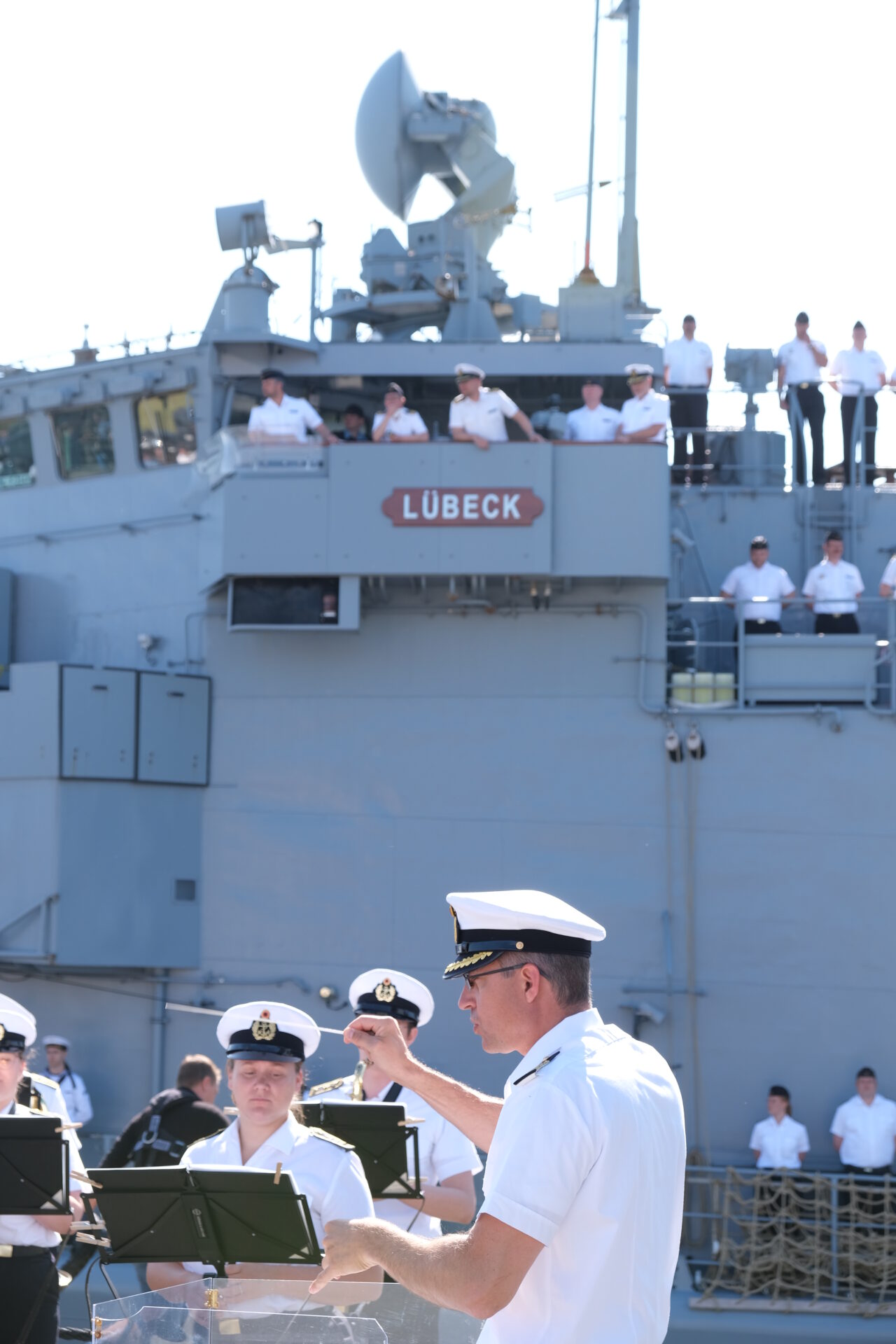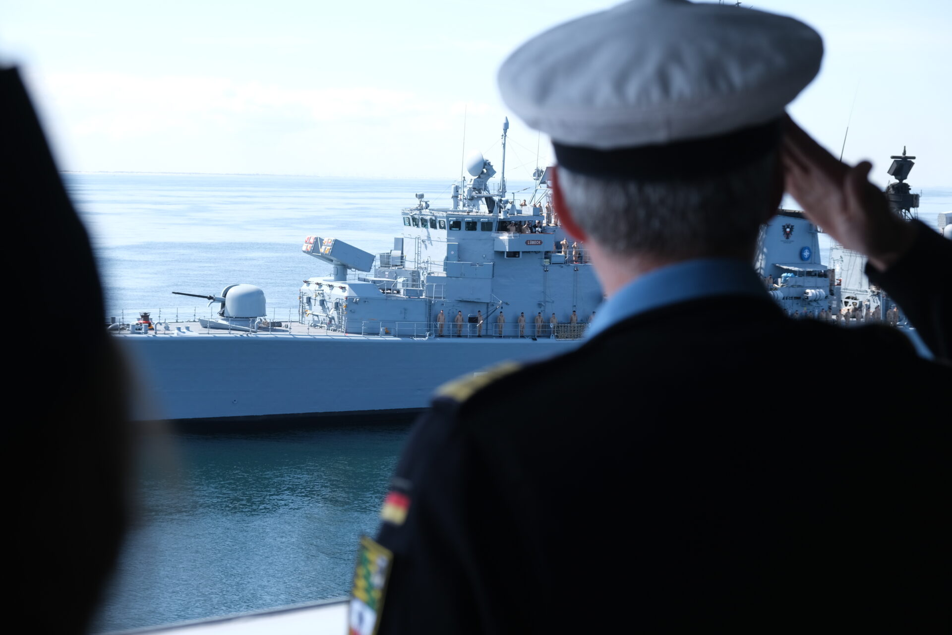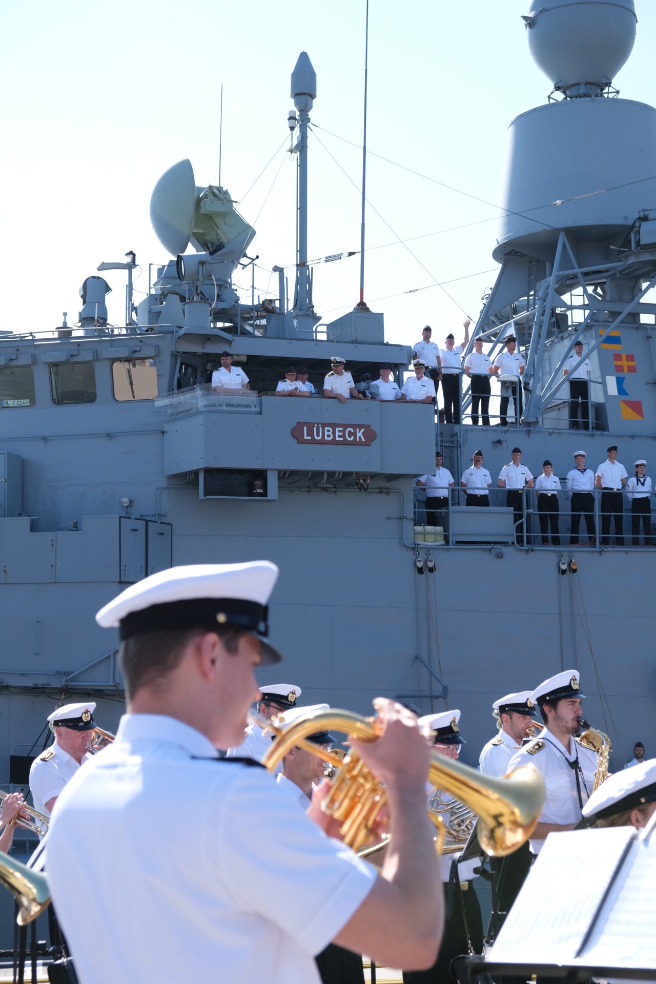 Am Tag zuvor war das alte, aber sehr gut aussehende Schiff von ihren "Nacholgerinnen" "Sachsen-Anhalt" und "Nordrhein-Westfalen" in heimischen Gewässern begrüsst und auf ihrem letzten Weg die Jade entlang begleitet worden. An Bord waren der Kommandeur der Einsatzflottille 2, Flottillenadmiral Axel Schulz und der Kommandeur Einsatzkräfte aus dem Marinekommando, Konteradmiral Jürgen zur Mühlen. Letzterer war auch einer von sieben ehemaligen Kommandanten, die Fregattenkapitän Röckel, letzter Kommandant der "Lübeck", an Bord begrüßen durfte.