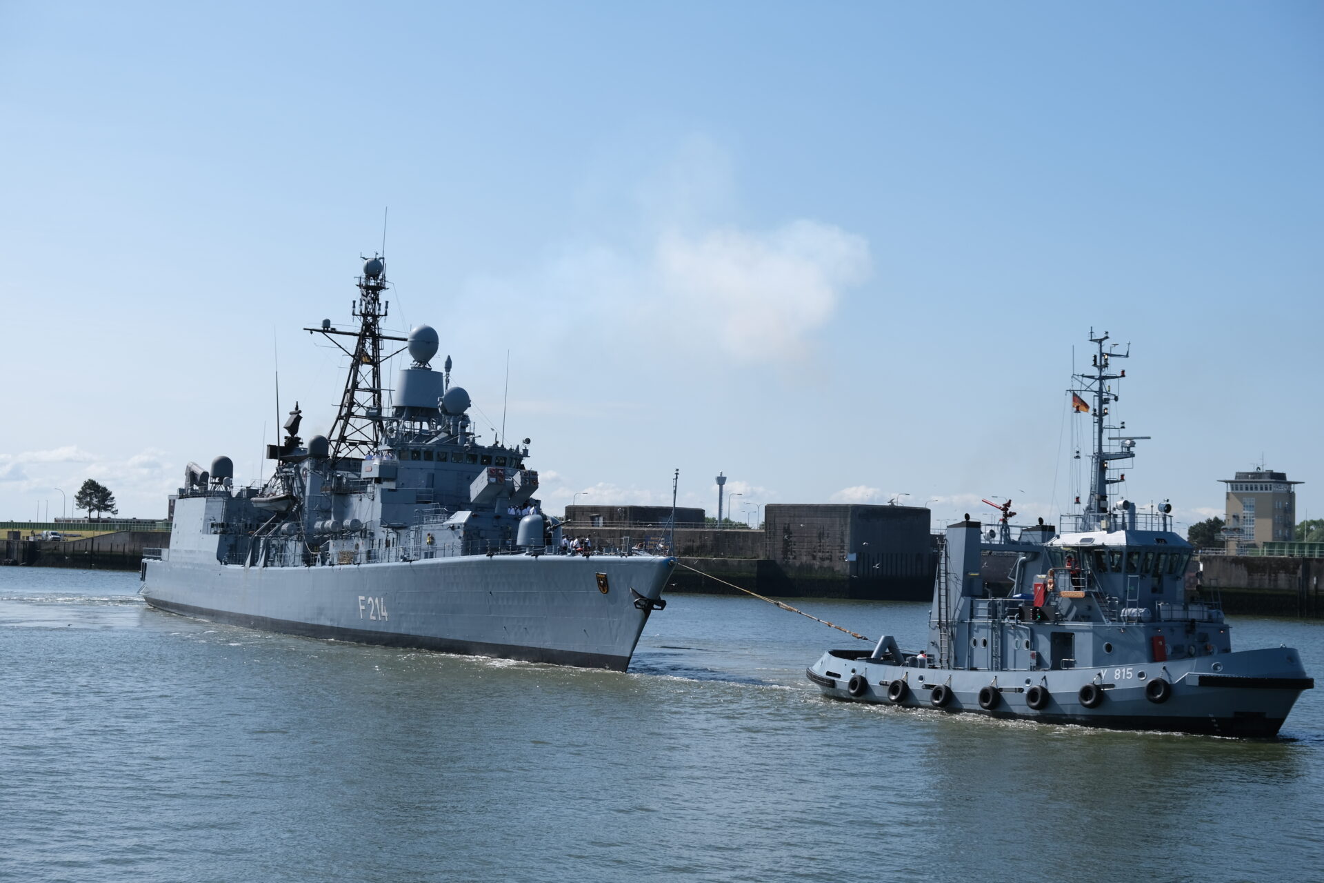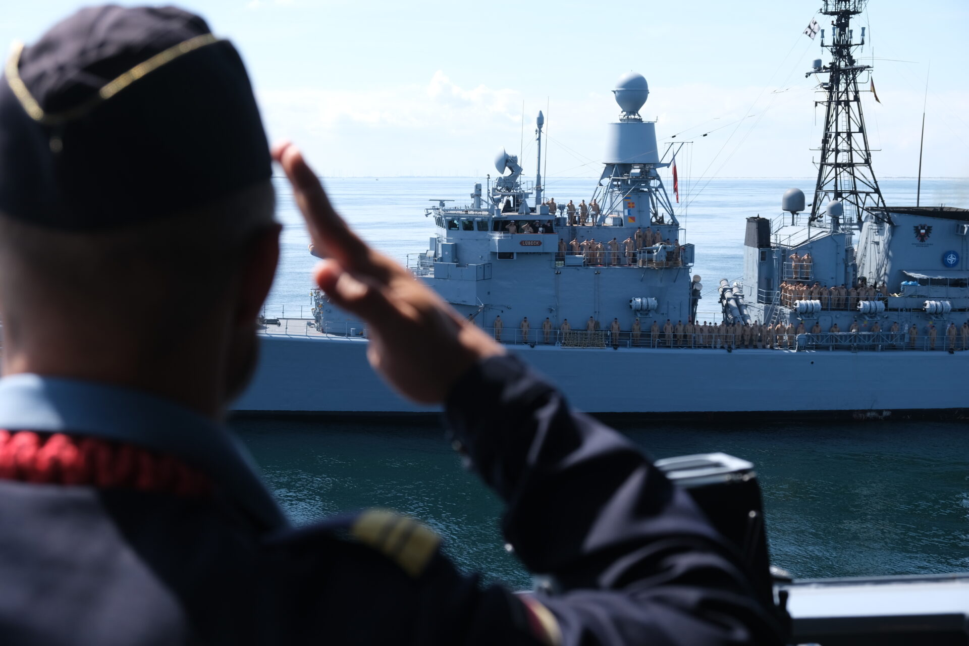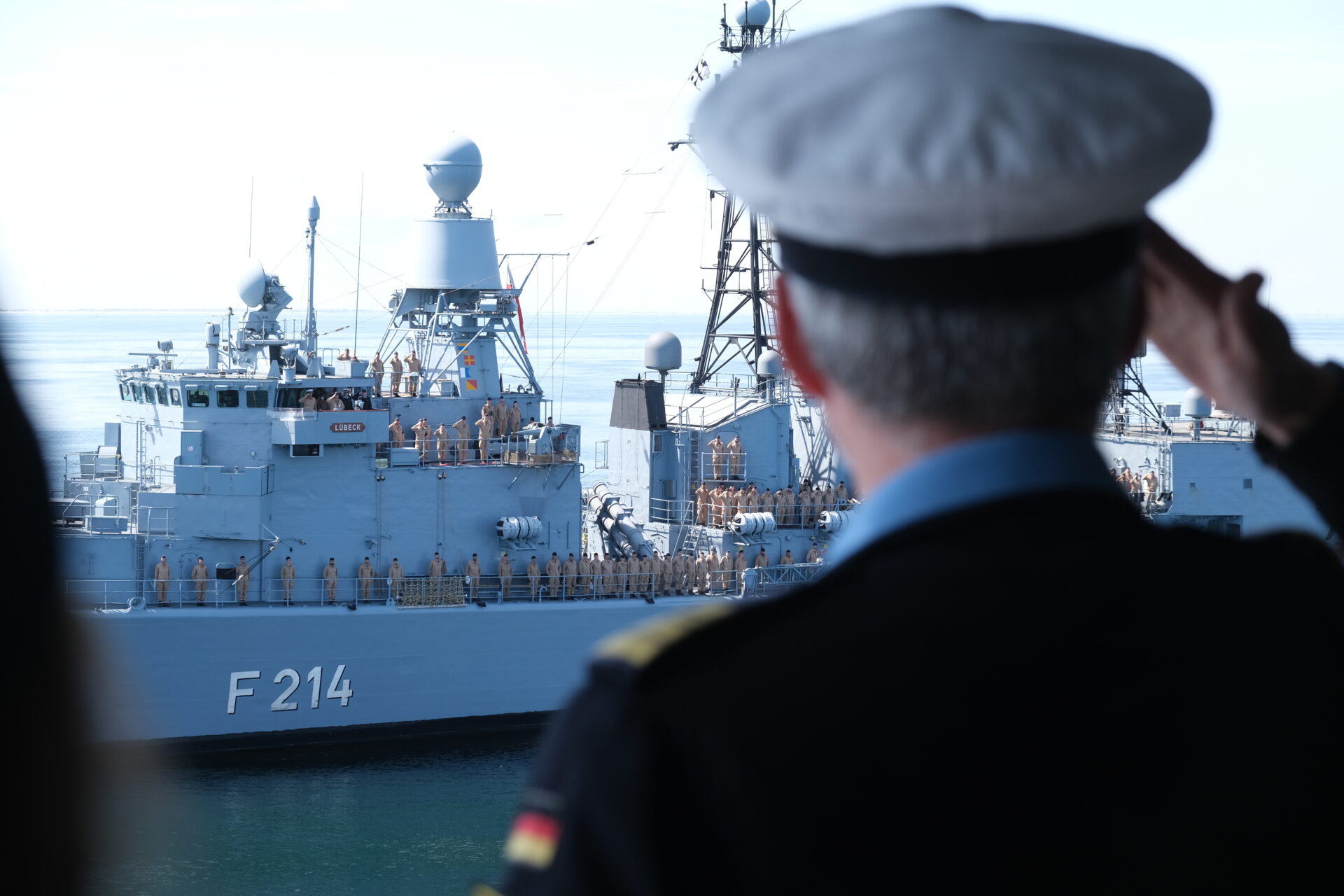 Am Tag zuvor war das alte, aber sehr gut aussehende Schiff von ihren "Nacholgerinnen" "Sachsen-Anhalt" und "Nordrhein-Westfalen" in heimischen Gewässern begrüsst und auf ihrem letzten Weg die Jade entlang begleitet worden. An Bord waren der Kommandeur der Einsatzflottille 2, Flottillenadmiral Axel Schulz und der Kommandeur Einsatzkräfte aus dem Marinekommando, Konteradmiral Jürgen zur Mühlen. Letzterer war auch einer von sieben ehemaligen Kommandanten, die Fregattenkapitän Röckel, letzter Kommandant der "Lübeck", an Bord begrüßen durfte.