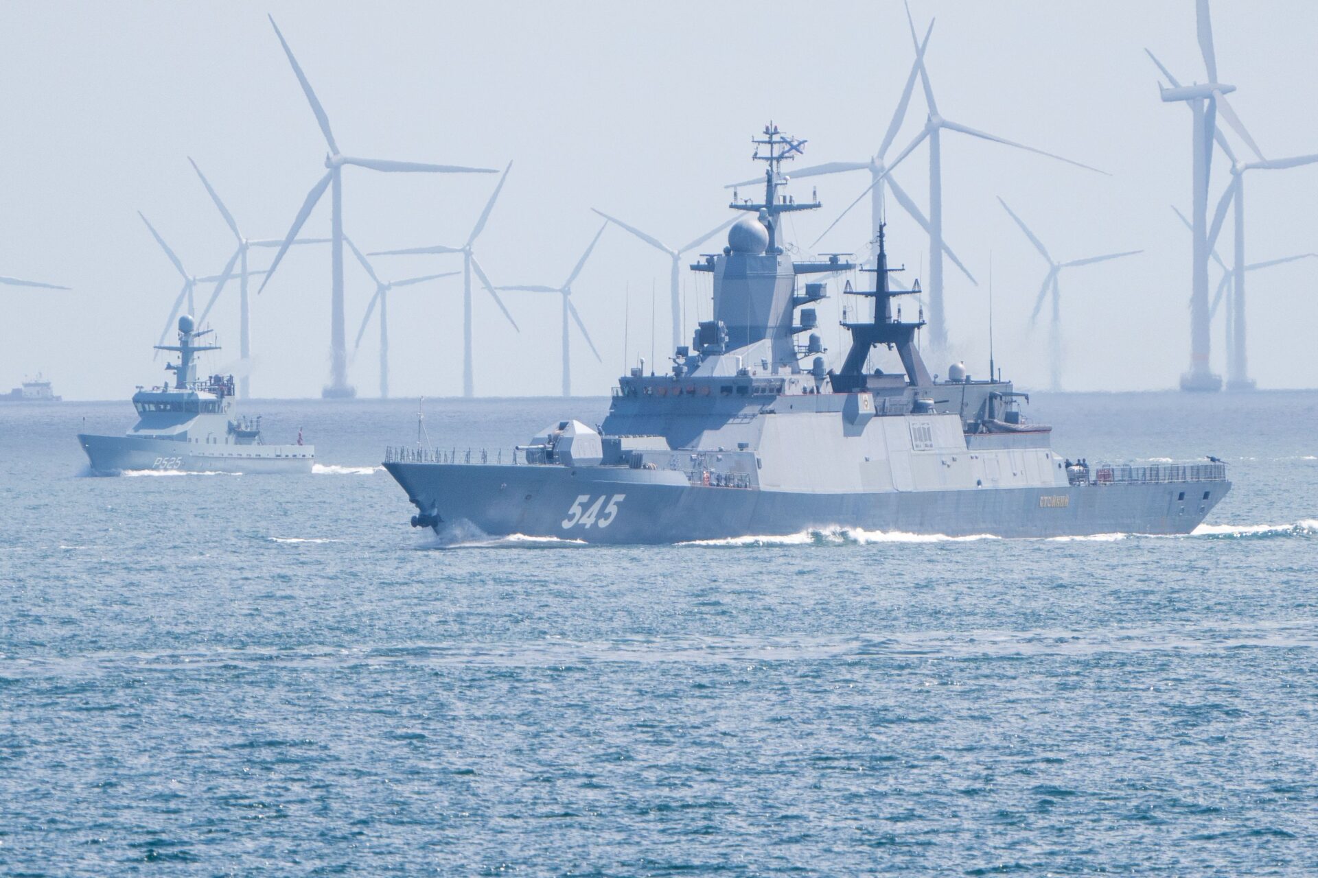 Auf den Fotos sind am Backbordseite der Korvette RFS Stoikiy (545) das Einsatzschiff FGS Bad Bramstedt (BP 24) der Bundespolizei See und das Patrouillenboot HDMS DNK Patrol P 525 der Königlich Dänischen Marine, das das russische Kampfschiff eskortiert, erkennbar.