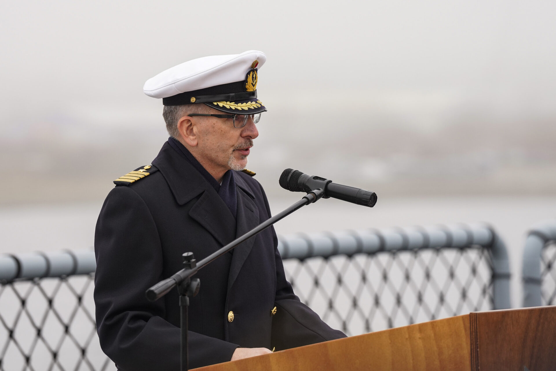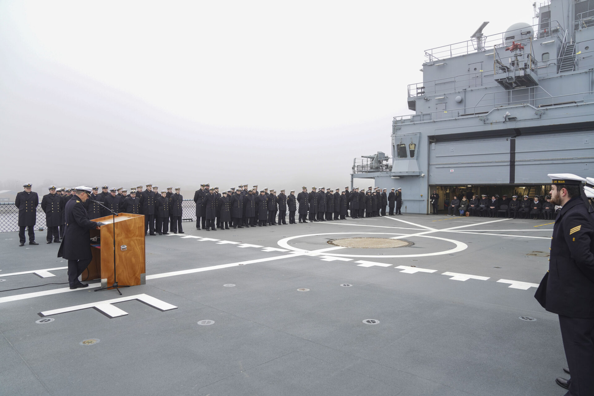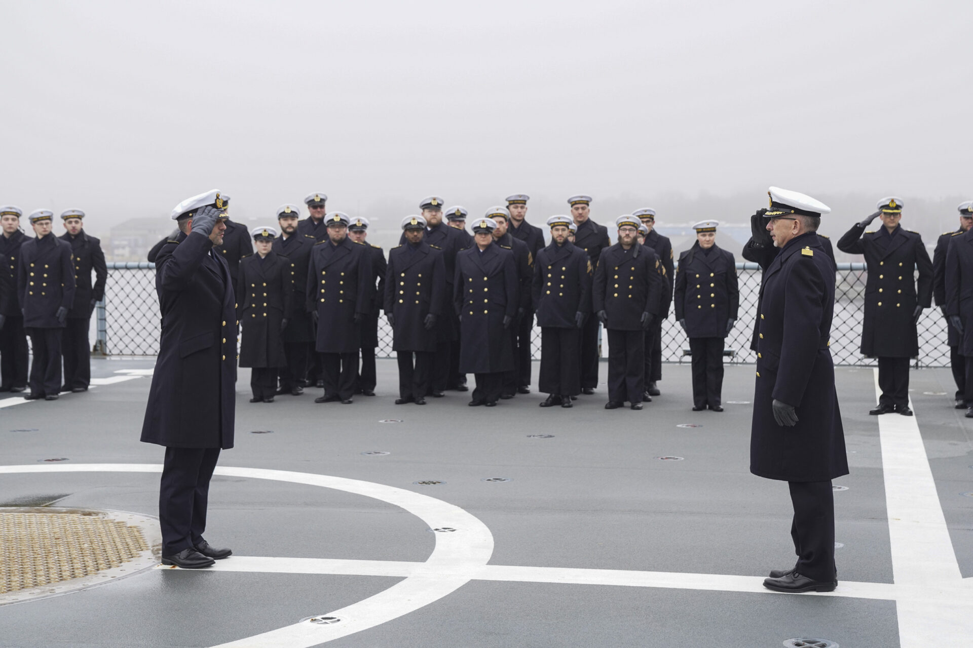 The commander of the troopship squadron, Captain Andreas Schmekel, hands over command from Frigate Captain Hanno Weisensee to Frigate Captain Sebastian Fliege, Photo: Leon Rodewald