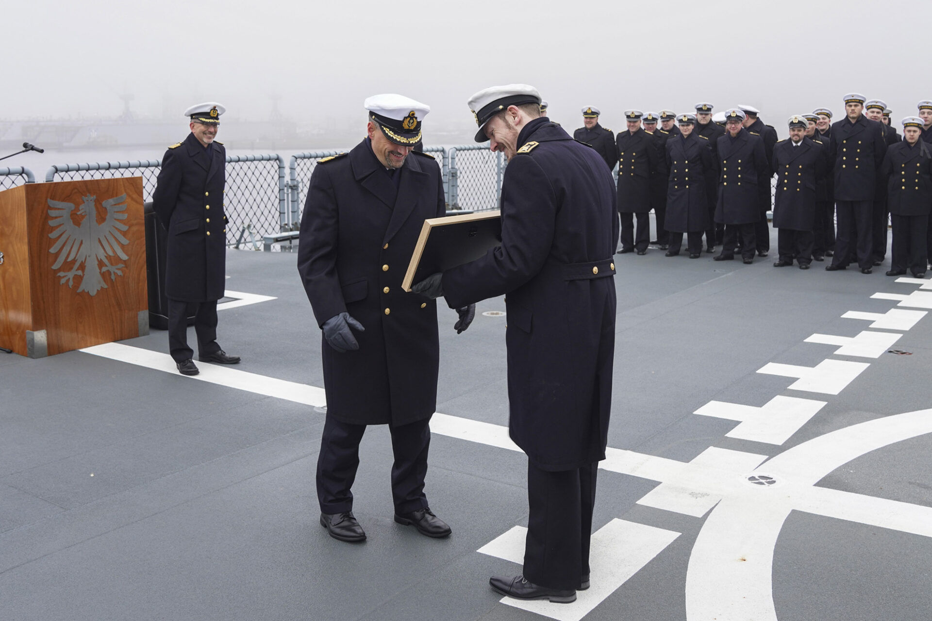 In his speech, Frigate Captain Weisensee compared his five years in command to a rollercoaster ride. He took command of the "Frankfurt am Main" during the shipyard phase, which he described as anything but easy. This was followed by the demanding operational training programme, which was completed in exemplary fashion."Whether it was the 'BALTOPS' manoeuvre, NATO support in the Aegean or preparing for the evacuation of German citizens from Lebanon as part of Operation Gulfstream, the crew mastered every challenge brilliantly," sums up Frigate Captain Weisensee. A very special part of the rollercoaster journey was the participation in the Indo-Pacific Deployment 2024. 14 ports in eleven countries were visited and 42,000 nautical miles travelled in the seven months. He was able to experience countless highlights with his crew during this once-in-a-lifetime tour. Weisensee would have loved to remain in command of the "Frankfurt am Main" for longer. "But you always have to get off the rollercoaster when it's at its best," says Weisensee, looking at his successor, Frigate Captain Fliege.Frigate Captain Weisensee is moving from the North Sea coast to the Federal Office of Defence Infrastructure, Environmental Protection and Services (BAIUDBw) in Bonn."After assignments at the Naval Command and the Federal Ministry of Defence, it is important for me to get back on board quickly and make my contribution to the operational readiness of the 'Frankfurt am Main' so that the obligations within the German Navy, but also towards NATO and our allies, can be fulfilled. It is with great pleasure that I take on this task and the associated responsibility and I am ready to tackle the numerous challenges together with an experienced crew," says the new Commander Frigate Captain Fliege.He is no stranger to the squadron, as he was first officer of the sister ship "Berlin" for three years back in 2015.