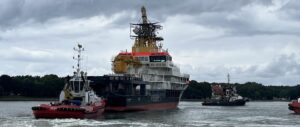 The Multipurpose vessel-Shell construction on the way from Klaipėda to the shipyard ABEKING & RASMUSSEN