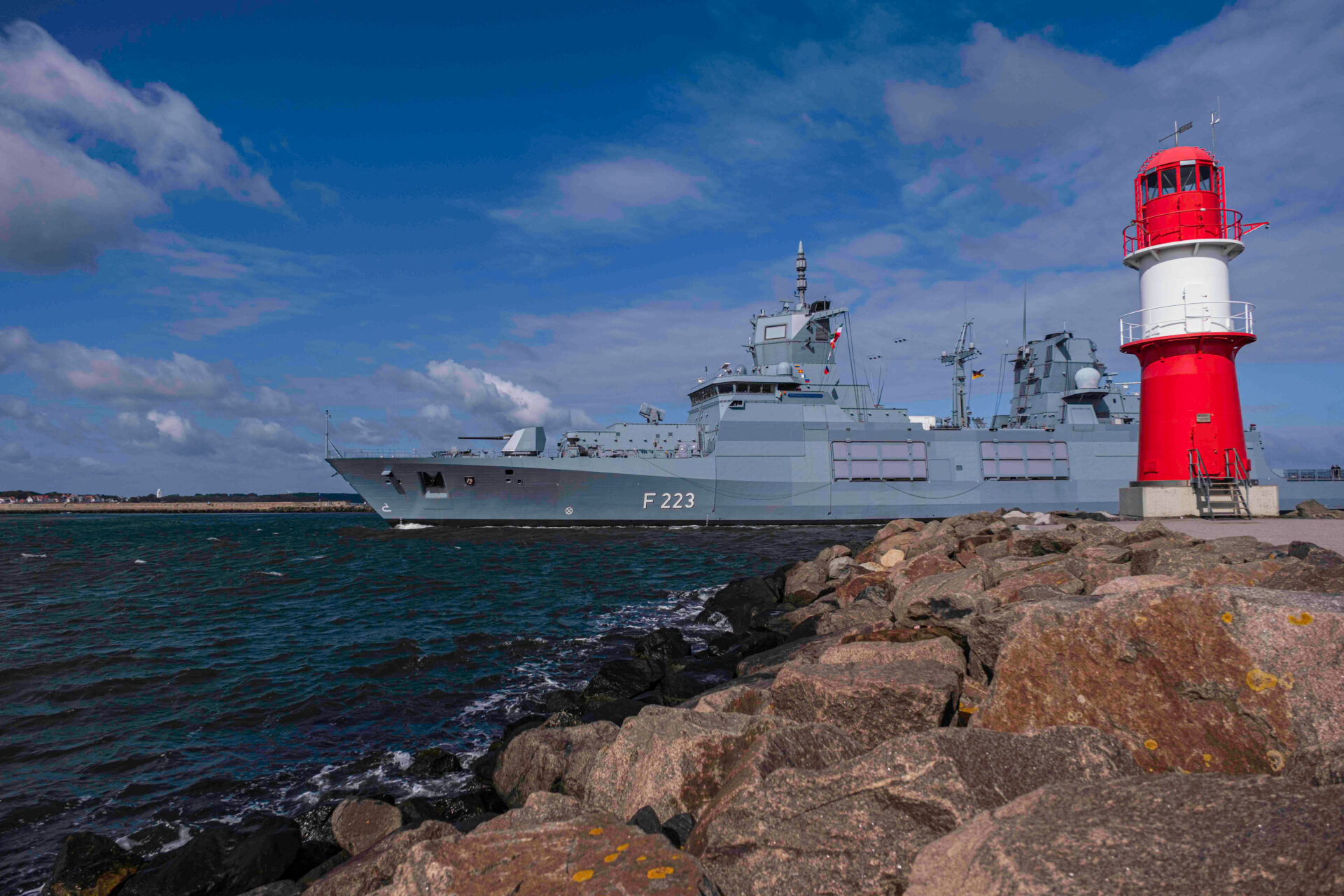 Fregatte „Nordrhein-Westfalen“ am Leuchtturm. Foto: Daniel Angres