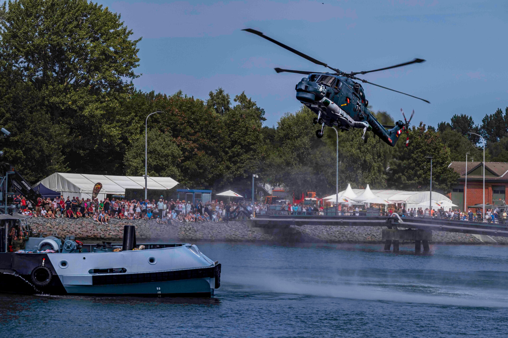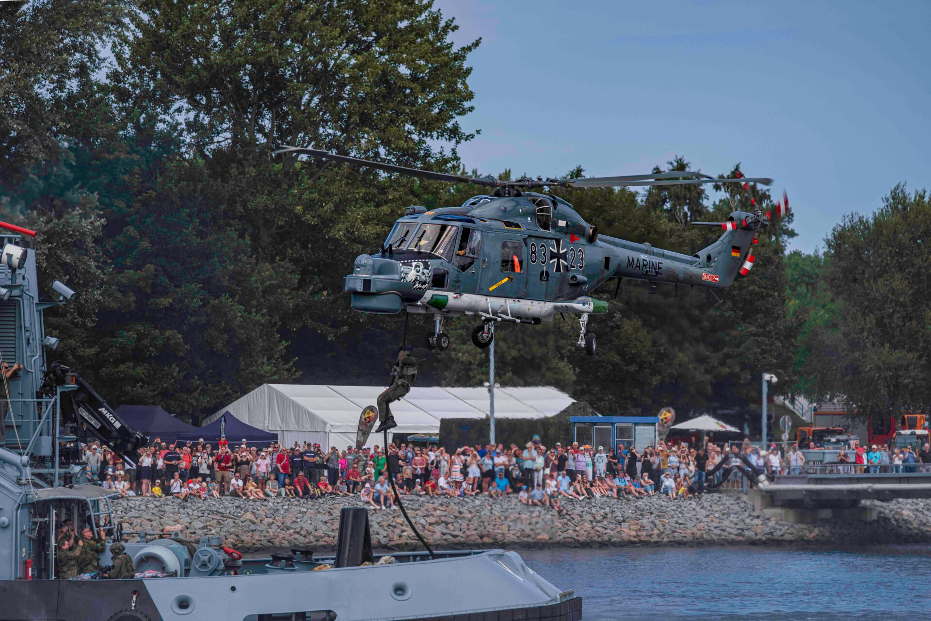 Neben den Kräften der Bundeswehr waren auch zahlreiche Behörden der sogenannten Blaulichtfraktion vertreten. Polizei, Feuerwehr, Technisches Hilfswerk und andere Einsatzorganisationen informierten über ihre Aufgaben und Einsatzmöglichkeiten. Besonders eindrucksvoll präsentierten sich die Marineflieger gemeinsam mit den Fallschirmjägern aus Seedorf sowie der Polizei Hamburg. Im Marinestützpunkt Hohe Düne zeigten sie in einem dynamischen Zusammenspiel mit dem Hafenschlepper Langeness ihre Fähigkeiten. Die Vorführung bot den Zuschauern ein lebendiges Bild von Kooperation und Präzision auf dem Wasser und in der Luft.