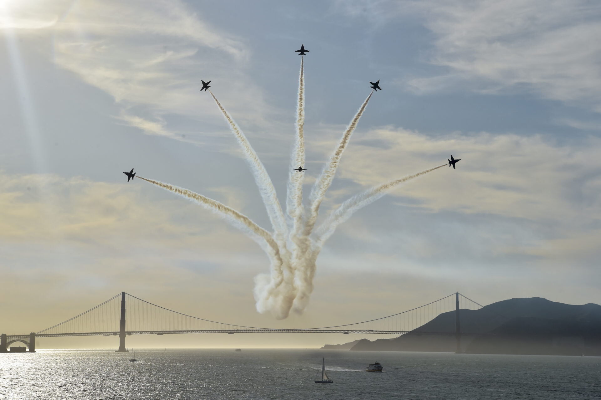 Blue Angels beim "delta breakout" über der Golden Gate Bridge, während der Fleet Week Air Show, San Francisco. Foto: US Navy
