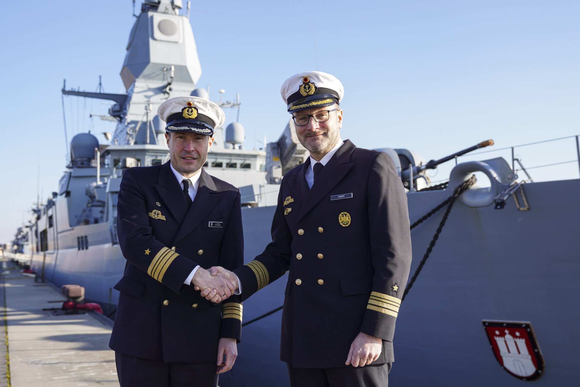 Fregattenkapitän Schmidt wird in einigen Tagen seinen neuen Dienstposten beim Deputy Supreme Allied Commander Europe (DSACEUR) im belgischen Mons (SHAPE) übernehmen. Die Fregatte „Hamburg“ ist für Fregattenkapitän Timpf kein unbekanntes Schiff. So gehörte er bereits im Jahr 2011 für vier Jahre der Bordbesatzung an. Zuletzt war Timpf Einsatzstabsoffizier im niederländischen Brunssum.
