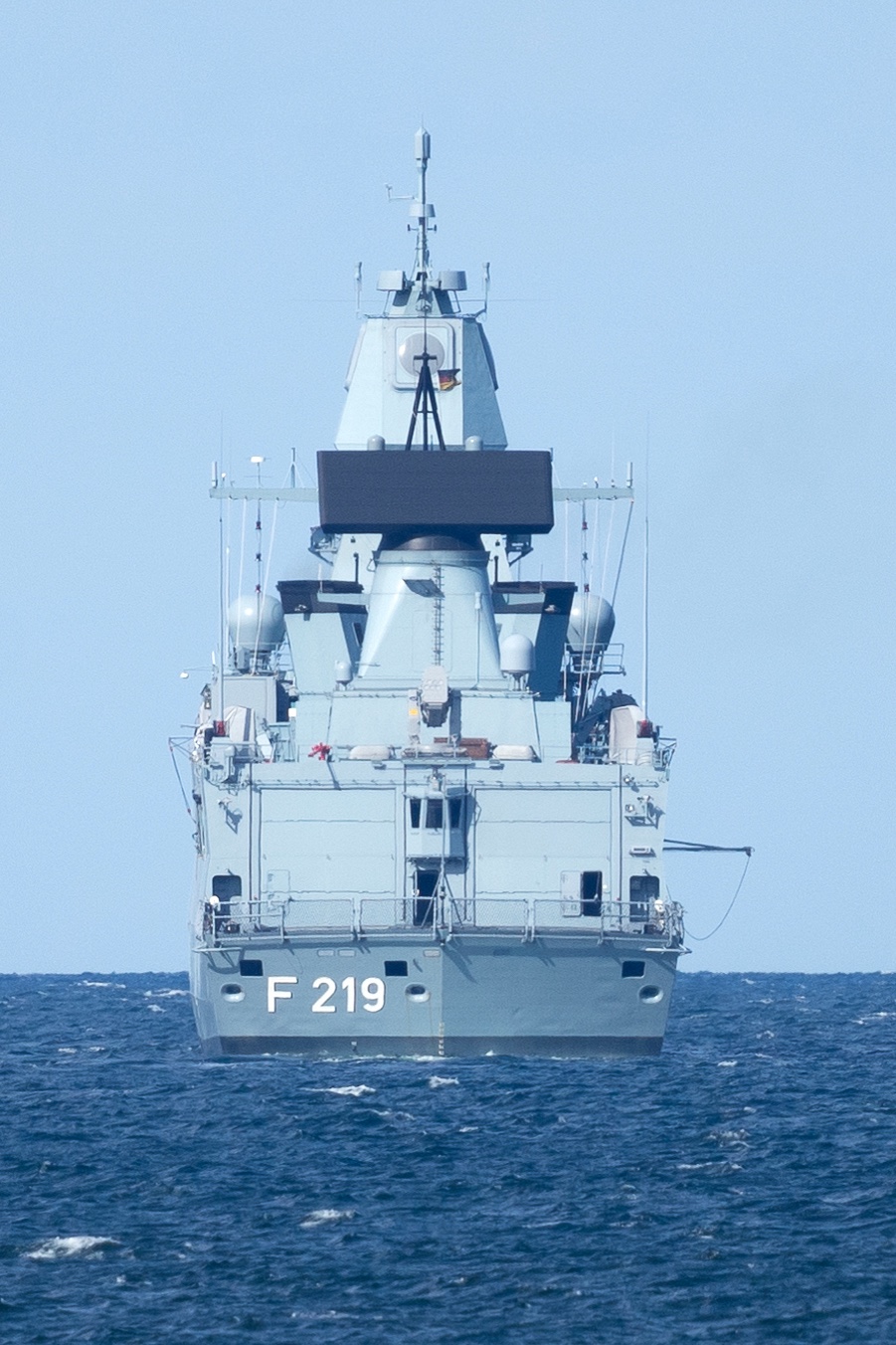Während der Erprobungsmaßnahmen war für andere außerhalb der Sperrgebiete am Seeverkehr teilnehmende Personen an Backbord- und Steuerbordseite der Fregatte jeweils ein großer Warnhinweis „KEEP CLEAR – TURN AWAY“ angebracht.