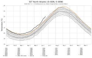 Mit Hilfe von Satelliten und Messbojen wird seit über 20 Jahren die Temperatur der Meeresoberfläche aufgezeichnet. In einigen Seegebieten des Vereinigten Königreichs und Irlands liegt die Wassertemperatur Mitte Juni 2023 bereits 4 bis 5 °C über dem normalen Wert. Dies ist sehr ungewöhnlich, noch nie war zu Beginn des Sommers so warm.
