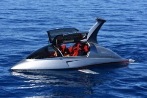 "Jet Shark" ist größer, hat einen navalisierten 500 PS V8-Corvette-Motor im Bauch und fasst vier Personen in der klimatisierten Flügeltüren-Kabine. Er kann mit bis zu 50 Knoten auf dem Wasser gleiten, aber auch allerlei Kunststücke in und über Wasser durchführen - fast wie ein echter Delfin. Er kann selbst bei diesem Antrieb bis zu einer halben Minute mit 20 Knoten abgetaucht unter Wasser fahren - nicht tief, aber so, dass mit der Periskopkamera in der Rückenflosse das Überwassergeschehen gerade noch beobachtet werden kann. "Jet Shark" ist zwar noch ein Prototyp, aber die Nachfrage nach dem rassigen Vorgängermodell lässt einen beträchtlichen Bedarf auch an dem geräumigeren Spassfahrzeug erwarten.