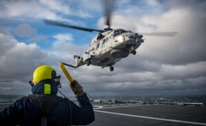 Niederländischer NH-90 nach der Betankung auf der Fregatte "Hessen". Foto: Bundeswehr/C.Kloecking