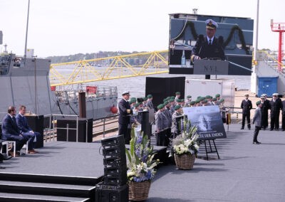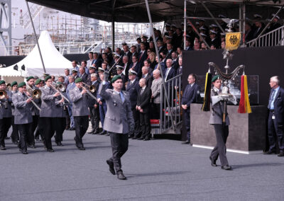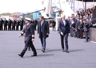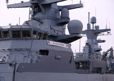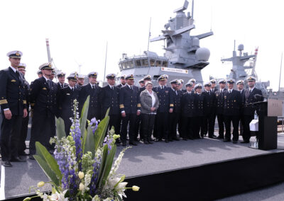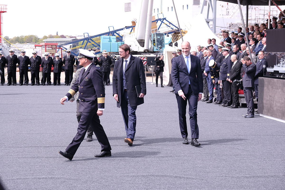Der Befehlshaber der Flotte und Unterstützungskräfte, Vizeadmiral Frank Lenski, unterstrich in seiner Ansprache die Bedeutung der Korvette als Spezialisten der Randmeerkriegführung. Das Einsatzspektrum reicht von der Friedenspräsenz über militärische Aufgaben der Krisenbewältigung bis zum Kampf in Randmeeren und der Waffenwirkung an Land.