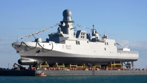 "Damsah", die zweite Fregatte der "Doha"-Klasse für Katar beim Stapellauf. Foto: Fincantieri
