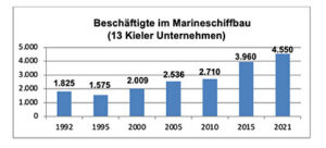 Kiel verfügt mit 13 Unternehmen und 4516 direkt in der Wehrtechnik Beschäftigten über einen leistungsfähigen Marineschiffbau. Dieser ist mit seinen Schlüsseltechnologien ein wichtiger Bestandteil der deutschen Rüstungsbasis. Damit hat der Marineschiffbau für Kiel eine besonders hohe, in den letzten Jahren stark gewachsene wirtschaftliche und industriepolitische Bedeutung. Während sich seit 1990 die Industriearbeitsplätze in der Landeshauptstadt von 22 000 auf 12 000 fast halbiert haben, konnten die im Marineschiffbau tätigen Unternehmen einen 150-prozentigen Zuwachs von 1825 auf 4550 Beschäftigte verzeichnen.