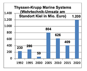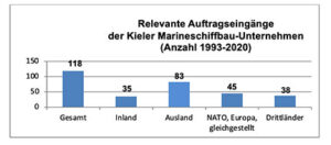 Die Marineindustrie hat sich in Kiel in den letzten 25 Jahren bei den Beschäftig-en und beim Umsatz insgesamt äußerst positiv entwickelt. Der jährliche Wehrtechnik-Umsatz, der zwischen einer und knapp zwei Milliarden Euro liegt, schwankt ins-besondere abrechnungstechnisch bedingt aber sehr stark. Der Exportanteil am Umsatz beträgt rund 50 bis 70 Prozent und ist seit der Wende weitaus stärker als der Inlandsumsatz gewachsen. Der Marineschiffbau konnte in Kiel einen permanenten Anstieg der Beschäftigten von 2180 im Jahr 1995 auf 4486 (+106 %) im Jahr 2020 verzeichnen.