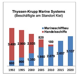 Auf dem ehemaligen Werftgelände von HDW in Kiel werden der starke Wandel und die strategische Neuausrichtung und wirtschaftliche Entwicklung des Schiffbaus besonders deutlich. Während 1992 in diesem Unternehmen von 4000 Beschäftigten nur 600 in der Wehrtechnik arbeiteten, sind jetzt 3463 Mitarbeiter im Marineschiffbau, 3081 bei Thyssenkrupp Marine Systems in Kiel und 382 bei German Naval Yards Kiel, und keiner mehr im zivilen Schiffbau beschäftigt. Diese Zahlen verdeutlichen den Wandel und die außerordentliche Bedeutung des Marineschiffbaus für die Stadt.