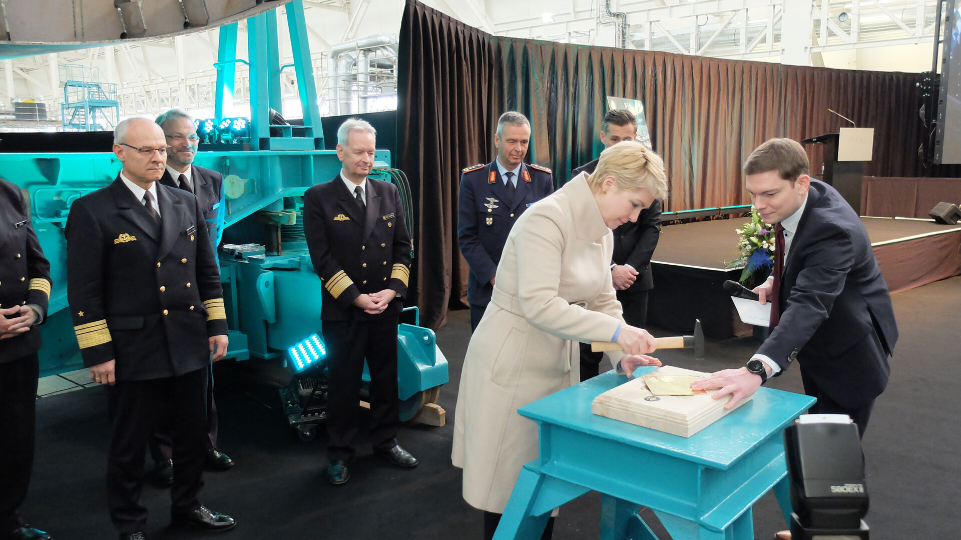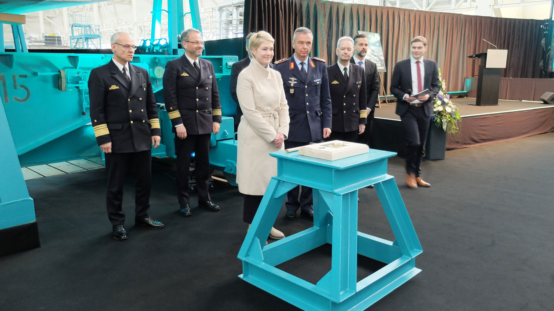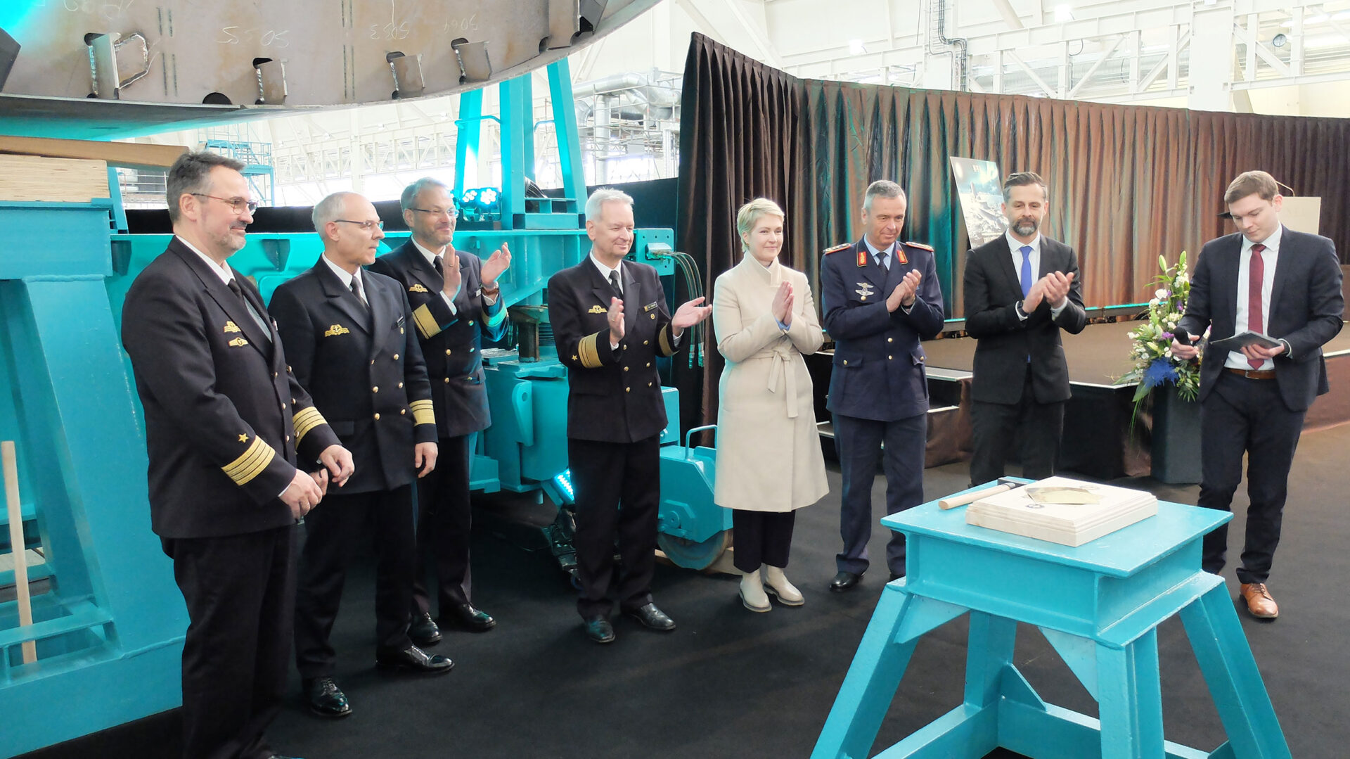 Tim Wagner, CEO der NVL Gruppe, bedankte sich bei der Ministerpräsidentin und ihrer Verbundenheit. Er könne sich zudem nicht daran erinnern, derart viele hochrangige Soldaten begrüßt zu haben. „Schiffbau ist Systemintegration von gesamtdeutscher Wertschöpfung“ sagte er. Auch wenn man im Zeitplan sei, die Bedrohung gebiete es, noch besser zu werden.