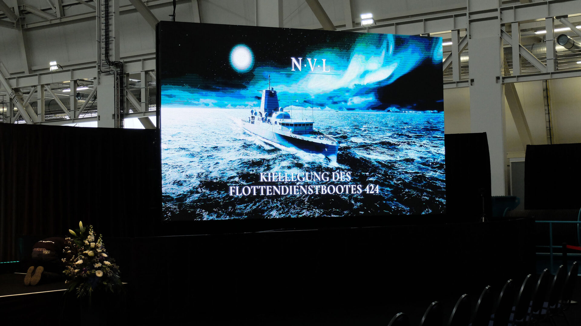 Rednerpult mit Präsentationsleinwand zur Kiellegung des Flottendienstbootes 424 Foto: hsc