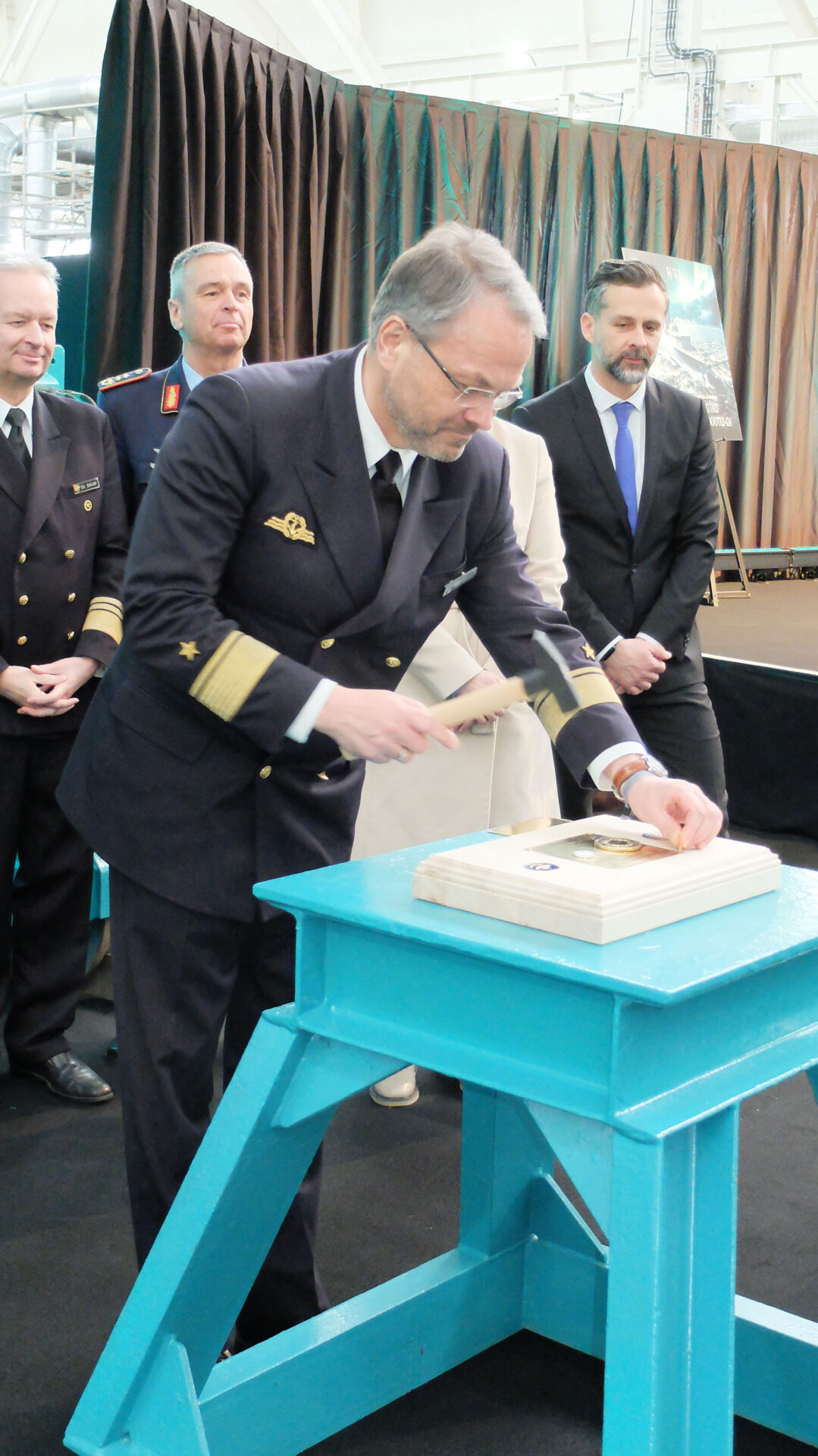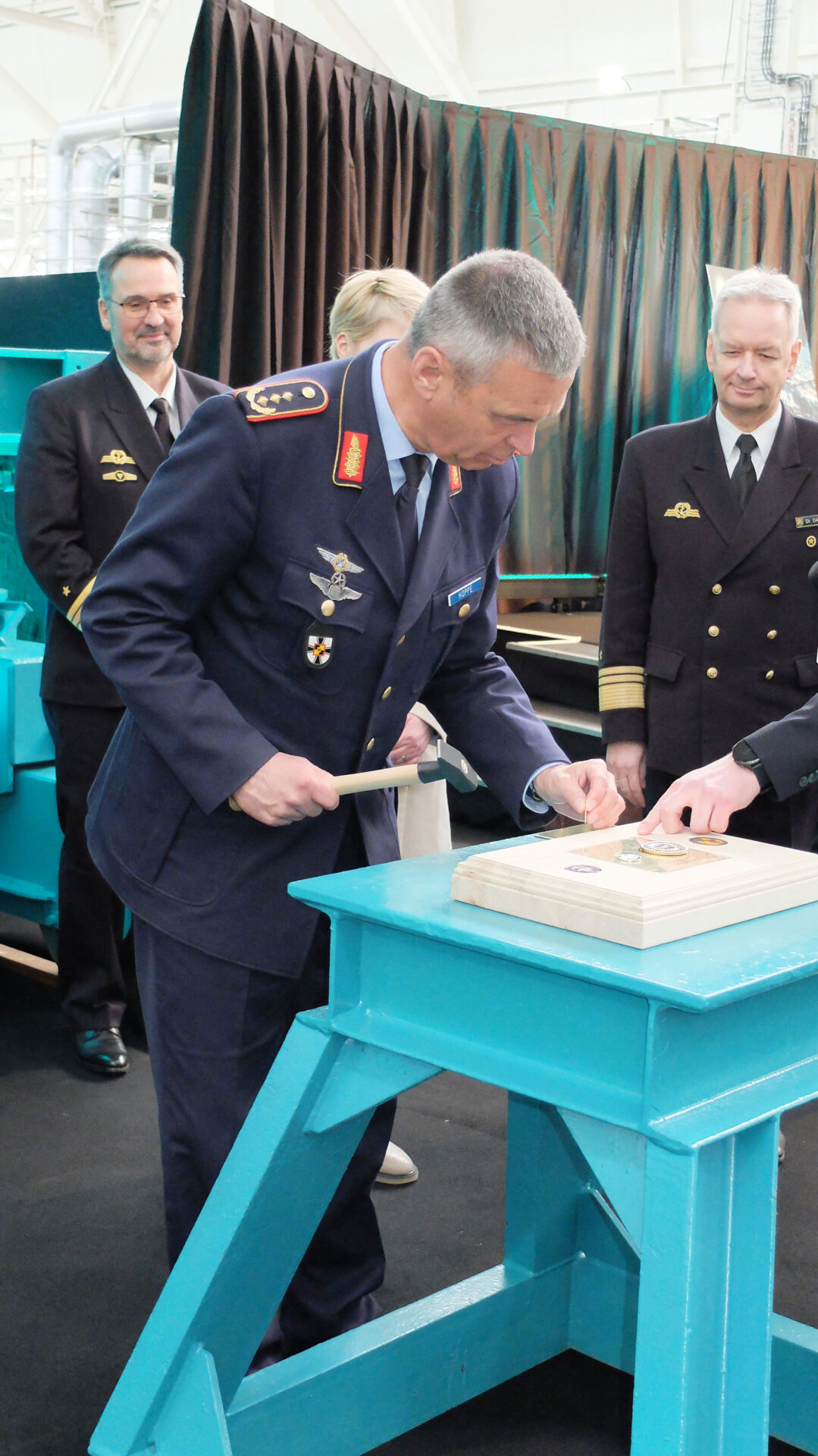 Gedenkmünze befestigt: Generalleutnant Andreas Hoppe schlägt die traditionelle Gedenkmünze zur Kiellegung ein. Foto: hsc