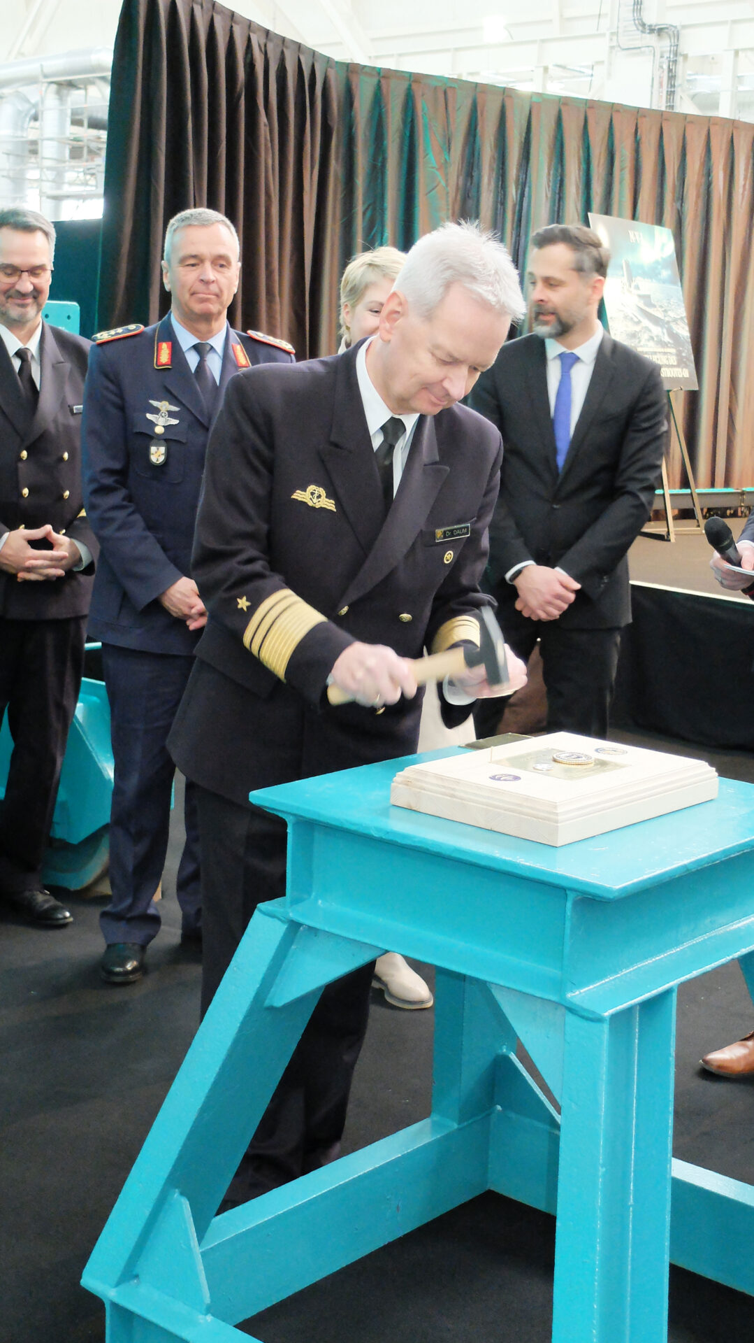 Mit seinem üblichen „Moin“ begrüßte der Inspekteur der Marine, Vizeadmiral Jan C. Kaack, die Gäste. „Was für ein Tag“ rief er aus und freute sich über den bedeutenden Schritt zur Modernisierung der Deutschen Marine. Er erinnerte erneut daran, wie sehr die Sicherheitslage in der Ostsee gefährdet sei, in dem er die kürzlichen Beschädigungen und Ankerverluste erwähnte. In diesem Szenario sei die Beschaffung der FD-Boote ein weiterer Schritt zur Modernisierung der Marine in einem zukünftigen Umfeld. „Wir brauchen die Aufklärung!“ sagte er und erinnerte daran, dass die derzeitigen FD-Boote bereits über 40 Jahre in der Marine Dienst leisten. Erneuerung „tut Not“. Er lobte die Peene-Werft für ihre „vernünftigen und klasse Produkte“. Die kommenden Monate würden noch so manche Herausforderung erbringen, aber er zeigte sich vom Gelingen überzeugt. „Die Kiellegung ist mehr als ein symbolischer Akt, sie ist wichtig für die Sicherheit der Bundesrepublik Deutschland.“ schloss er seine Rede.