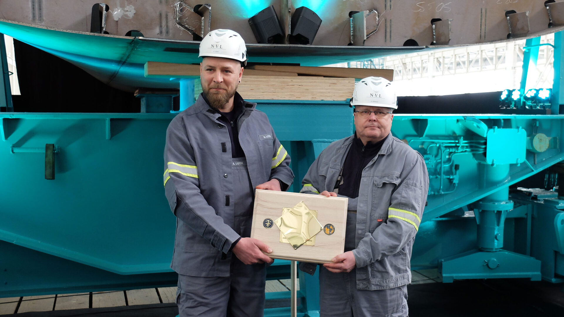 Werftmitarbeiter präsentieren Gedenktafel: Andre Loth und Heiko Schulz zeigen die eingebrachte Gedenkplatte zur Kiellegung der neuen Flottendienstboote. Foto: hsc