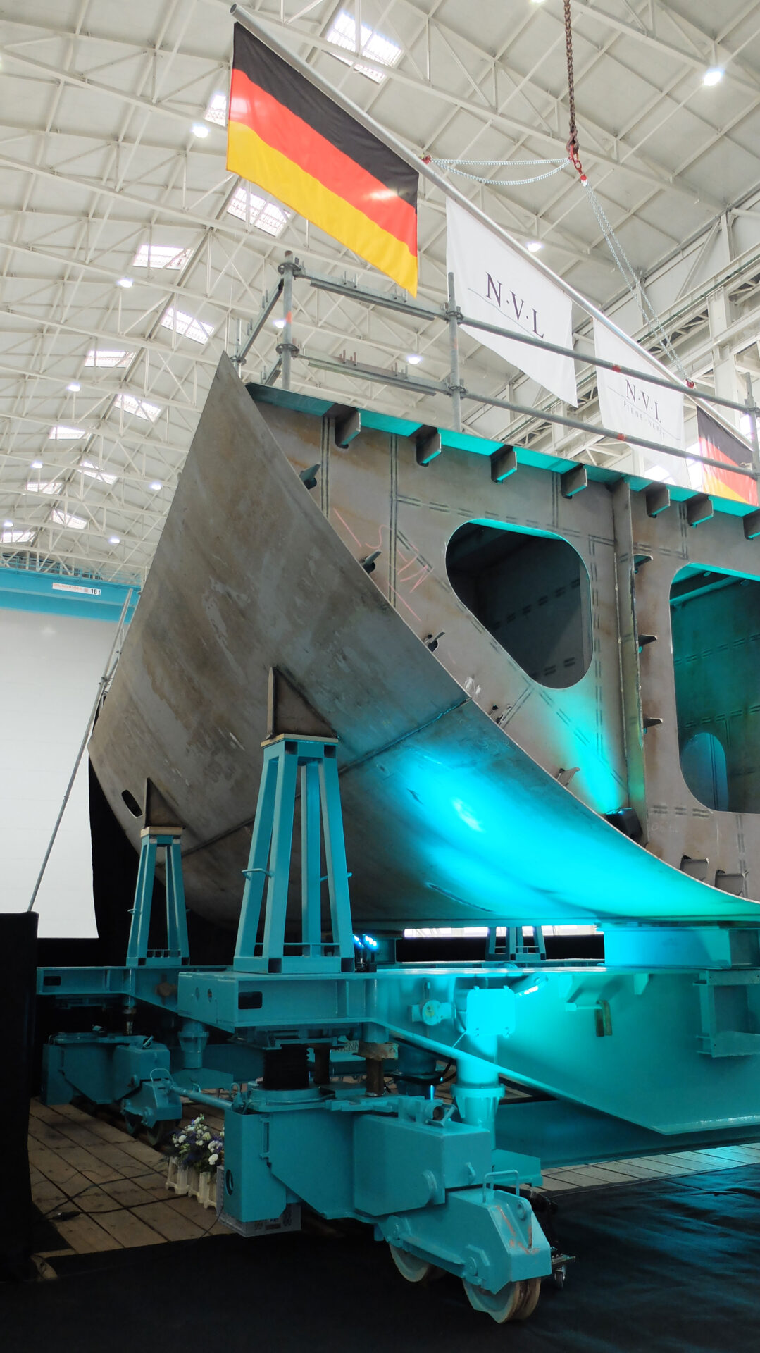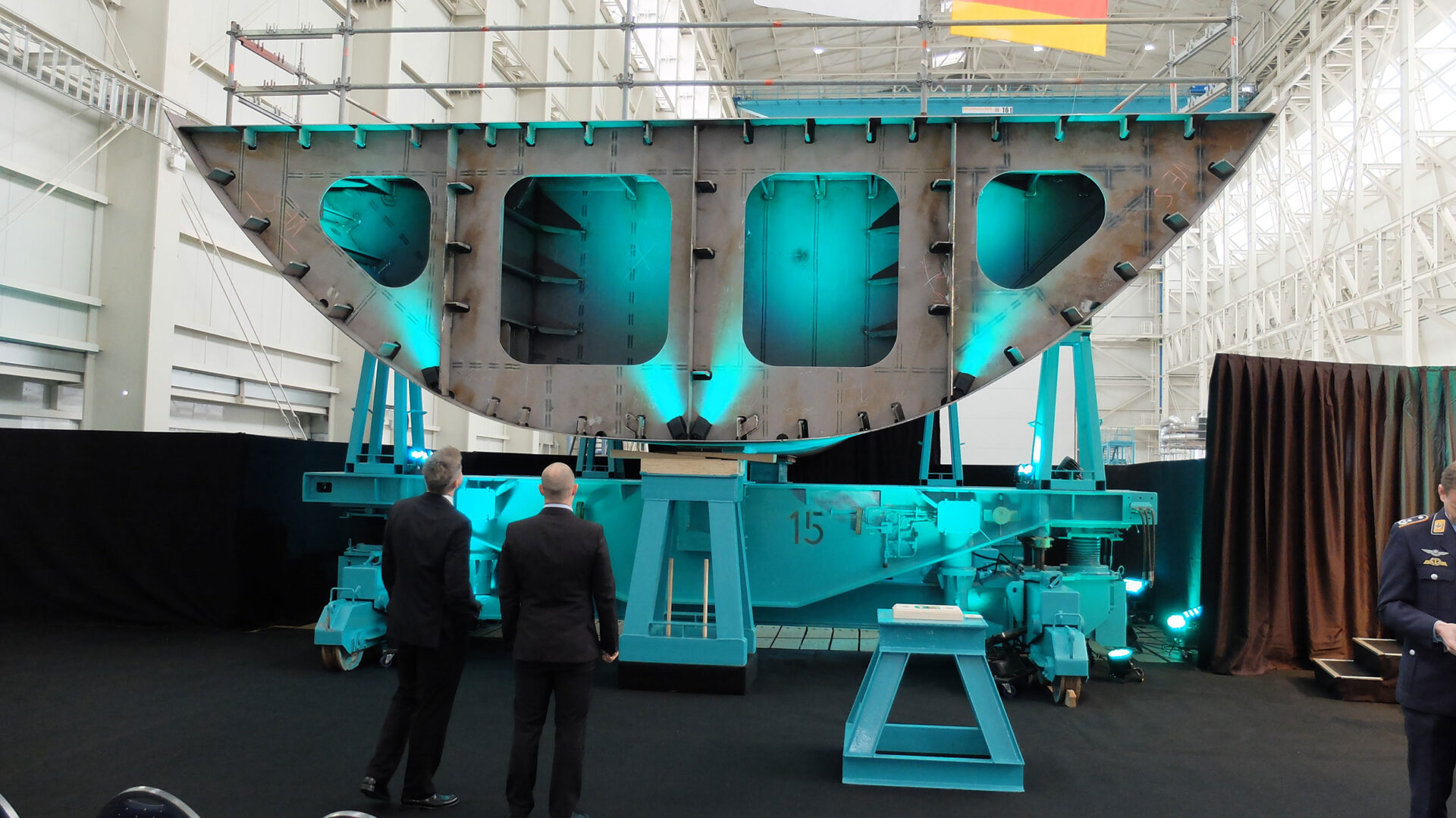 Vorschiff-Sektion mit Bundesflagge zur Kiellegung auf der Peene-Werft Wolgast Foto: hsc