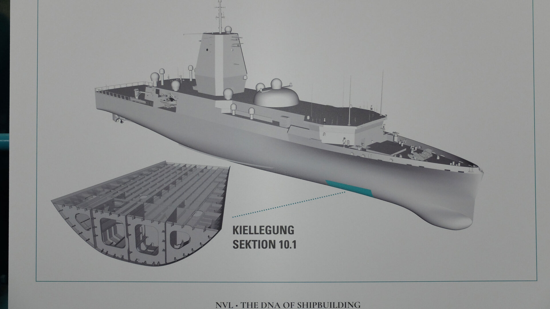 Skizze des neuen Flottendienstschiffs, mit Detailansicht der kielgelegten Sektion 10.1. Foto: hsc
