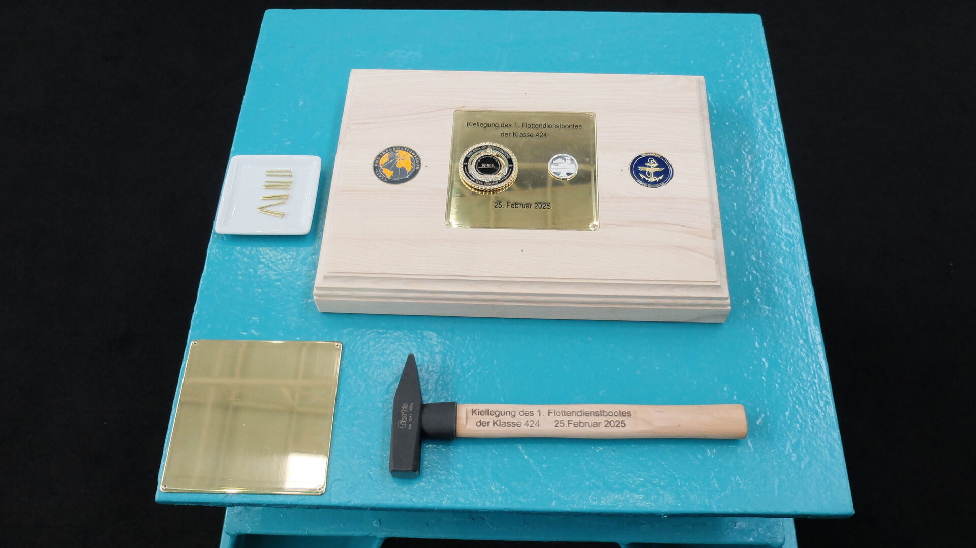 Die Gedenktafel zur Kiellegung: Die symbolische Gedenktafel mit der eingravierten Münze und Hammer zur Kiellegung der Klasse 424 vom 25. Februar 2025. Foto: hsc