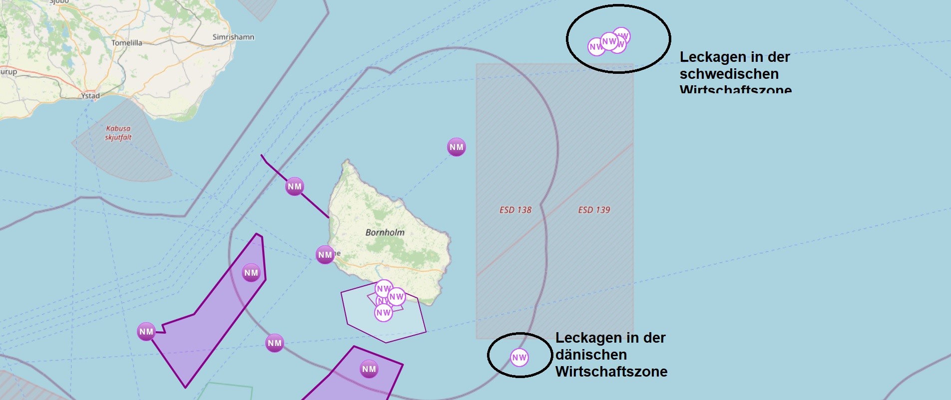 Danish Maritime Authority; NW = Navigatorische Warngebiete; ESD 138/139 = temporäre militärisch-technische Sperrgebiete. Karte: https://dma.dk/safety-at-sea/navigational-information/nautical-information. Ergänzungen in schwarzer Farbe: hum