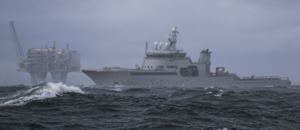 Infolge der mutmaßlichen Sabotage an den beiden Nord Stream-Pipelines lässt Norwegen seine Offshore-Anlagen von Küstenwache und Streitkräften überwachen. Foto: Das Foto zeigt das 4.000-Tonnen Küstenwachschiff „Sortand“ der Barentshav-Klasse auf Patrouille vor der Gasförderplattform Troll A, die als größte der Welt gilt.