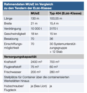 So oder so bedeutet dies in der Tendernachfolge wohl eine offensichtliche Abkehr vom existierenden Konzept der Mittleren Unterstützungseinheit schwimmende Einheiten (MUsE). Anfang 2021 wurden die Rahmendaten von MUsE durch einen Vertreter des Marinekommandos auf einer Konferenz in London der internationalen Öffentlichkeit vorgestellt.