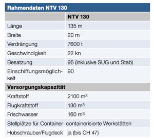 Dem im Zielbild formulierten grundsätzlichen Rückgriff auf unbemannte Systeme wird Rechnung getragen. Im NTV 130 sind Decks-Stauräume, Hangars sowie die systemoptimierten Aussetz- und Aufnahmevorrichtungen ebenso vorgesehen wie integrierte und modulare Kontrollstationen.