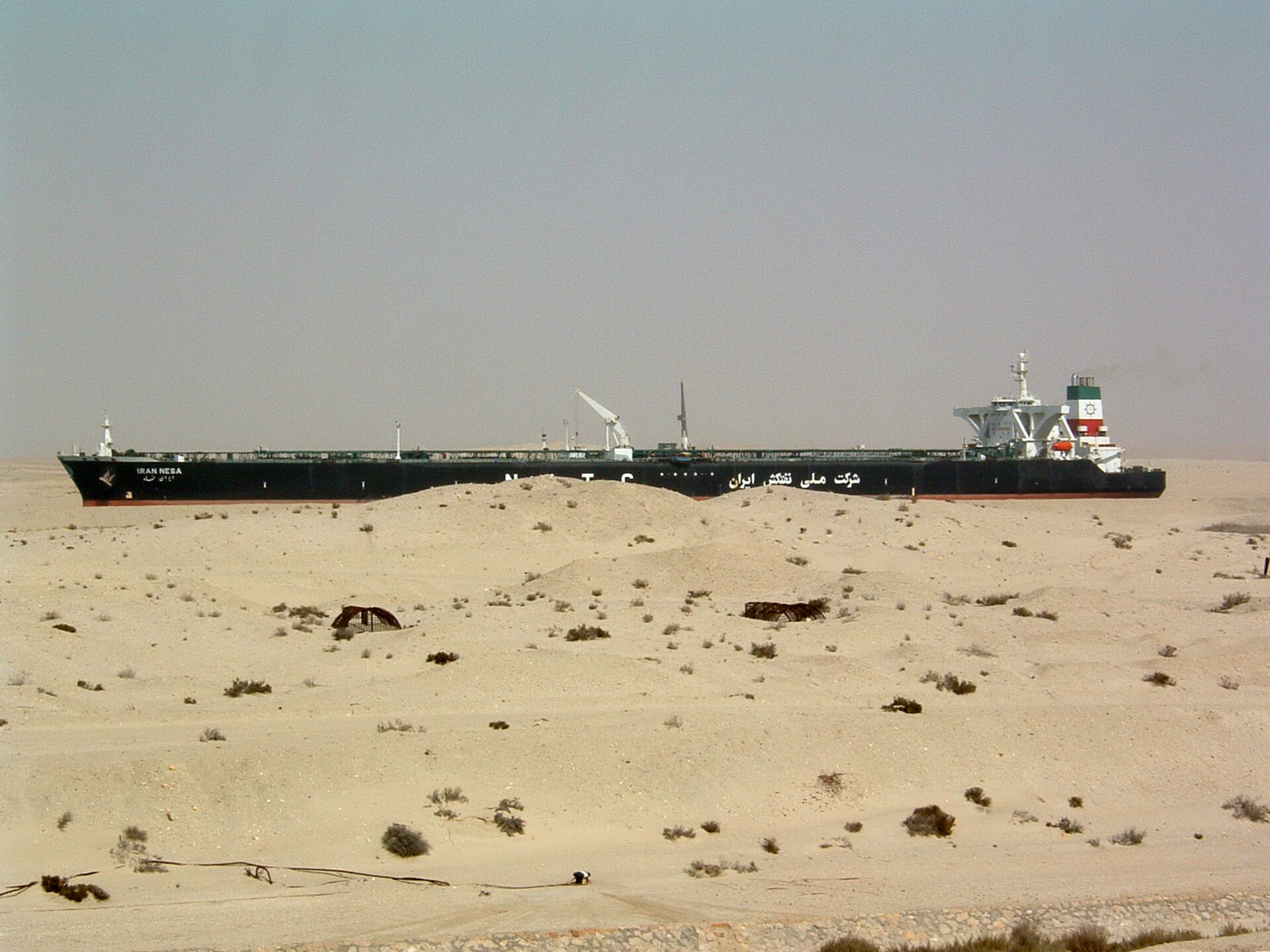 Im Meer aus Sand - ein "Wüstenschiff" - der iranische Rohöltanker "Iran Nesa" im Suezkanal. Quelle: Wikimedia Commons
