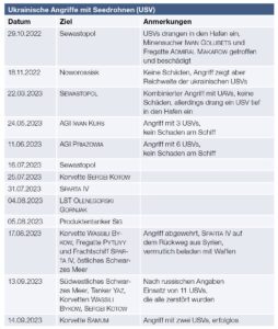 Russland hat seit der Versenkung der MOSKWA keine Mittel gegen die Flugkörperbedrohung von Land gefunden, sondern seine schwimmenden Einheiten von der ukrainischen Küste ferngehalten. Weiterhin fiel mit Blick auf die russische Operationsführung auf, dass Russland nie seine gesamte Schwarzmeerflotte eingesetzt hat. Mehrere Einheiten wurden nicht an den Operationen beteiligt, hierzu zählen Fregatten der Kriwak- und der ADMIRAL-GRIGOROWITSCH-Klasse. Ab Juli 2022 zogen sich russische Schiffe vor dem Hintergrund der FK-Bedrohung aus dem nordwestlichen Teil des Schwarzen Meeres zurück. Am 27. Juli wurde das Getreideabkommen geschlossen, welches die Blockade der ukrainischen Häfen beendete. Damit nicht genug, begann die Ukraine, die russischen Seestreitkräfte weiter unter Druck zu setzen. Am 31. Juli und am 20. August griffen ukrainische UAVs das Hauptquartier der Schwarzmeerflotte in Sewastopol an, ohne jedoch Schaden anzurichten. Im Oktober 2022 führte die Ukraine einen Angriff mit unbemannten Sprengbooten (Unmanned Surface Vehicles, USV) gegen Hafenlieger in Sewastopol aus und beschädigte einen Minenjäger und eine Fregatte. Am 8. Oktober griff die Ukraine die Brücke bei Kertsch mittels einer Autobombe an und zerstörte damit alle über die Brücke verlaufenden Straßen- und Eisenbahnverbindungen. Zum Ausgleich der fehlenden Verbindung setzte die russische Marine vermehrt Landungsschiffe ein.