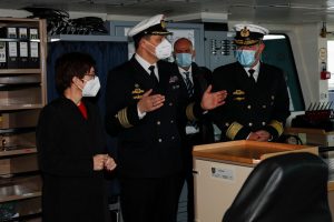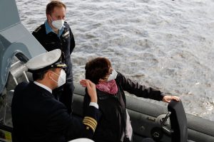Ministerin Annegret Kramp Karrenbauer mit Kommandant Fregattenkapitän Elmar Bornkessel und Flottillenadmiral Ralf Kuchler, Kommandeur der Einsatzflottille 2