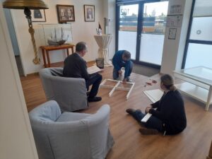 Herr Brüdegam, Herr Krause, Frau Gerhartz, beim Möbelaufbau.