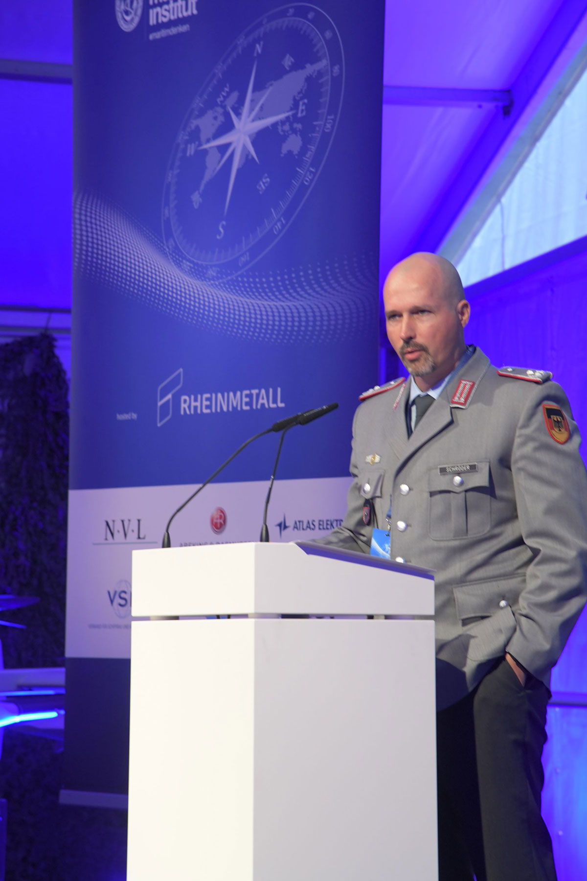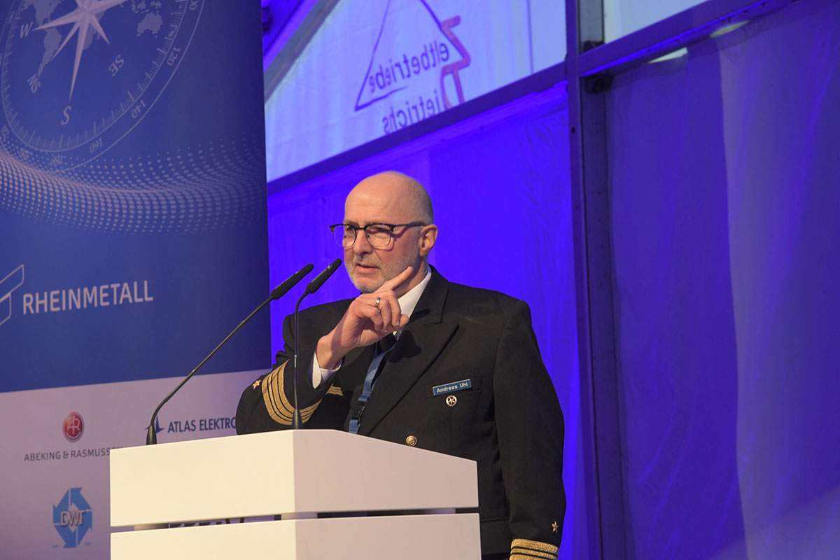 Durch die Veranstaltung führte Flottillenadmiral Sascha Rackwitz als designierter Vorsitzender des Gesamtvorstandes des Deutschen Maritimen Institutes. Als Gastgeber sprach Dr. Christian Martens, der designierte neue Leiter der in Bremen ansässigen Rheinmetall Business Unit Integrated Electronic Solutions.