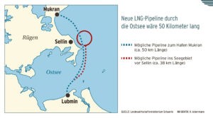 Die Pipeline von Mukran durch die Ostsee nach Lubmin ist erforderlich, weil die Wassertiefen vor Lubmin für die großen LNG-Schiffe zu gering ist.