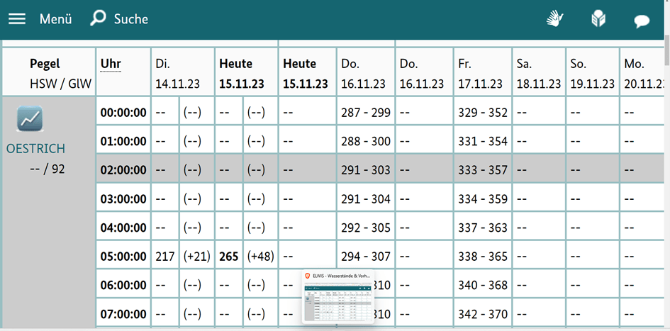 Rheinpegel in Oestrich am 15.11.2023. Grafik: ELWIS
