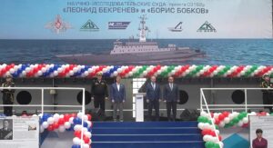 Per Videoschalte ging es in Komsomolsk-am-Amur (Ostküste) weiter auf dem Amur-Schiffbauwerk mit der Korvette „Razumnyy“ der Steregushchiy II-Klasse (Projekt 20385) sowie in Zelenodolsk (nahe Kazan, 500 Kilometer östlich von Moskau) mit zwei neuen Aufklärungsplattformen (wissenschaftliche Forschungsschiffe) des Projektes 03182r mit Namen „Leonid Bekrenev“ und „Boris Bobkov“. Beide Schiffe sind vorerst für die Nordflotte vorgesehen, andere Flotten werden sicher auch noch bedient, da wohl eine Serie von zwölf Einheiten vorgesehen ist. Diese könnten ein Nachfolgemuster sein für die seit einem halben Jahrhundert bekannten ELINT-Trawler der „Moma“ und „Alpinist“ Klassen. Technische Unterlagen sind ebenfalls noch nicht bekannt – die Grafik auf dem Werftfoto kann aber als grober Hinweis für das Aussehen genommen werden!