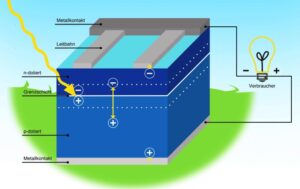 Solarzellen bestehen aus verschiedenen Halbleitermaterialien. Halbleiter sind Stoffe, die unter Zufuhr von Licht oder Wärme elektrisch leitfähig werden, während sie bei tiefen Temperaturen isolierend wirken. Ein idealer Halbleiter ist Silizium, da es in Quarzsand vorkommt, dadurch preiswert und in grossen Mengen erhältlich ist. Damit die positiven und negativen Ladungsträger richtig geleitet werden, wird das Halbleitermaterial «dotiert». Damit ist das definierte Einbringen von Kleinstmengen an chemischen Elementen (z.B. Bor oder Phosphor) gemeint, mit denen man entweder einen positiven Ladungsträgerüberschuss (p-leitende Halbleiterschicht mittels Bor-Atomen) oder einen negativen Ladungsträgerüberschuss (n-leitende Halbleiterschicht mittels Phosphor-Atomen) im Halbleitermaterial erzielen kann. Werden zwei unterschiedlich dotierte Halbleiterschichten gebildet, entsteht an der Grenzschicht ein sogenannter p-n-Übergang. An diesem Übergang baut sich ein inneres elektrisches Feld auf, das zu einer Ladungstrennung der bei Lichteinfall freigesetzten Ladungsträger führt. Die Ladungen werden dann via einer Leitbahn aus Silber zu Metallkontakten auf der Seite des PV-Moduls transportiert. Über diese Metallkontakte kann eine elektrische Spannung abgegriffen werden. Wird der äussere Kreis geschlossen, das heisst ein elektrischer Verbraucher angeschlossen, fliesst ein Gleichstrom.