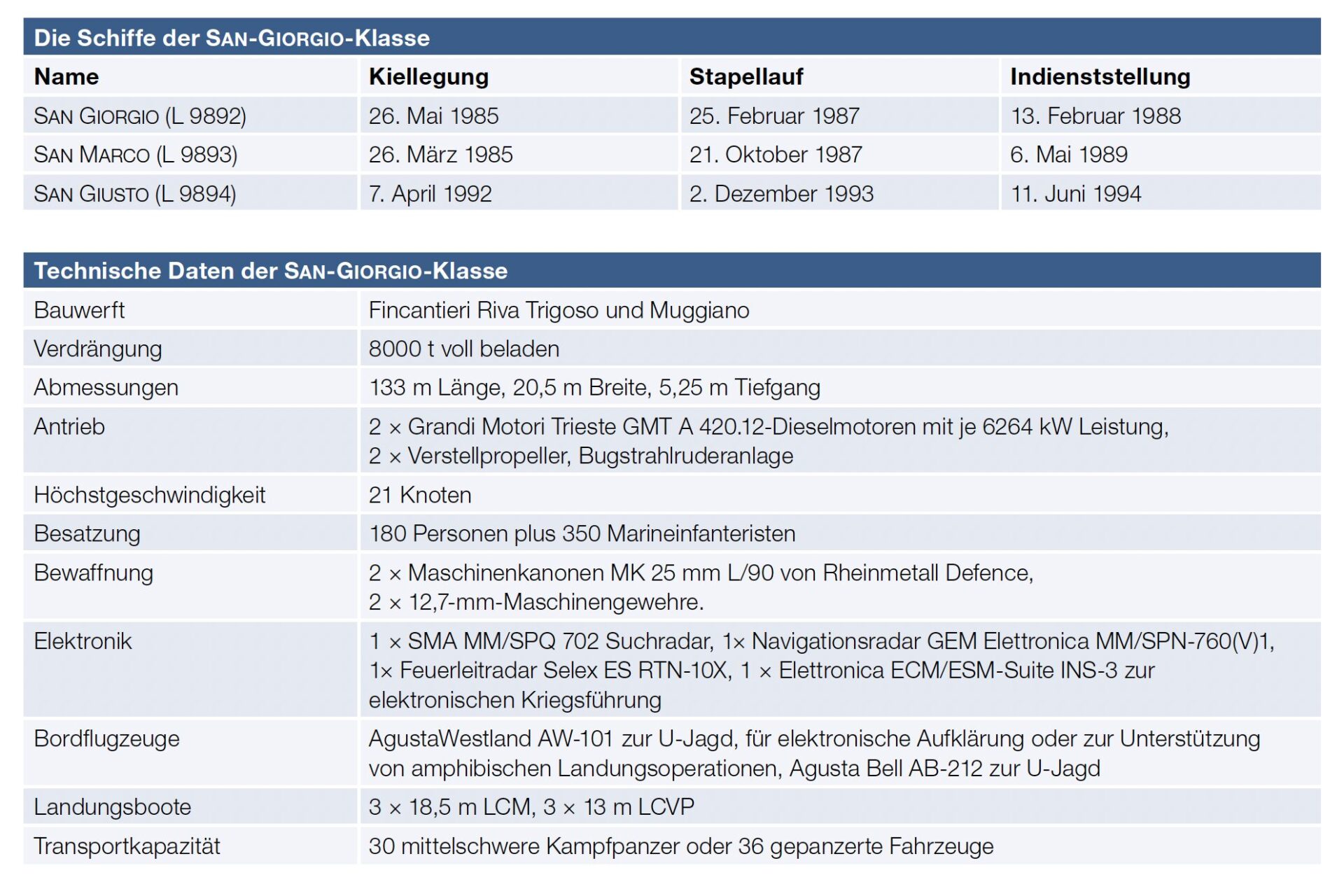 Neben den beiden Flugzeugträgern Giuseppe Garibaldi und Cavour betreibt die italienische Marine drei kleinere amphibische Einheiten der San-Giorgio-Klasse, die vielseitig einsetzbar sind. Zwei Schiffe – die San Giorgio und die San Marco wurden 1988/89 in den Dienst der Marina Militare gestellt. Ein drittes Schiff mit leicht modifiziertem Entwurf namens San Giusto folgte 1994.
